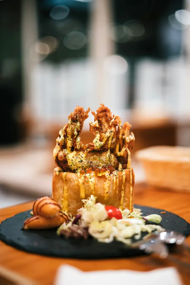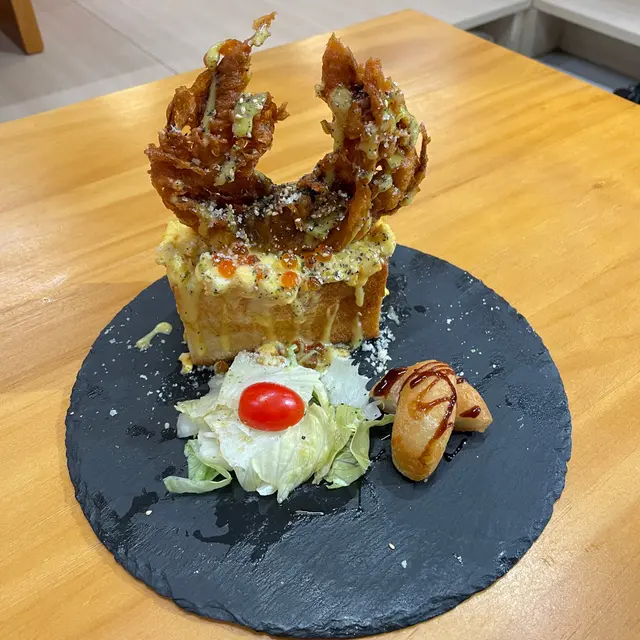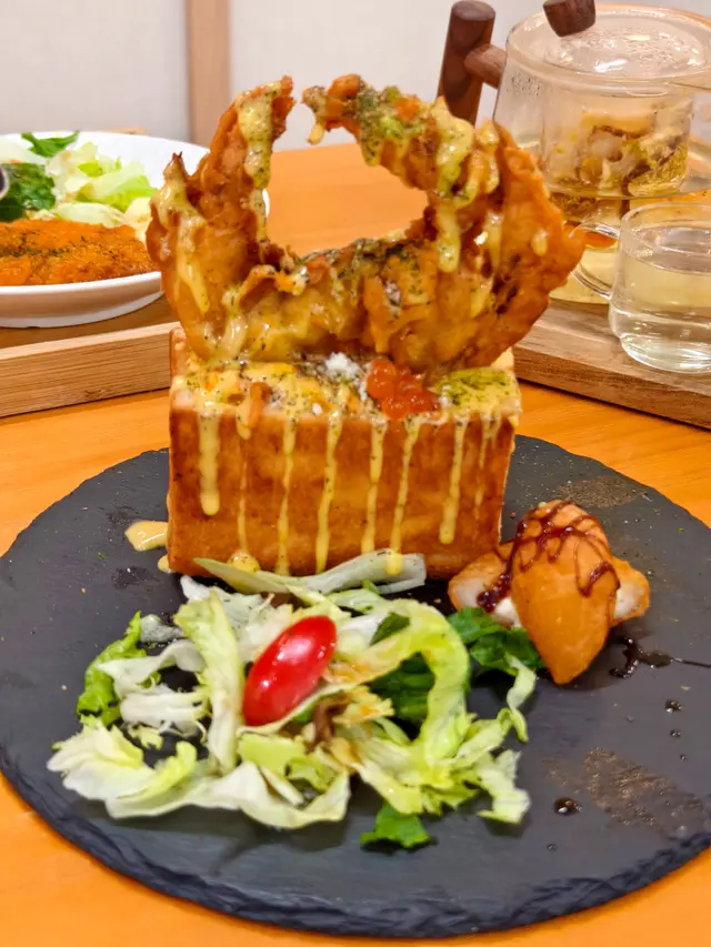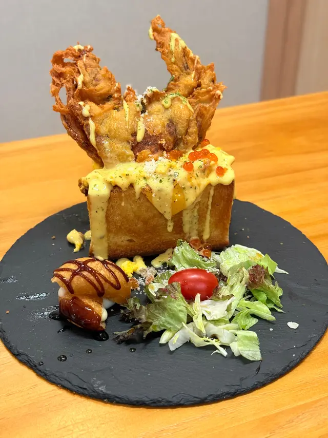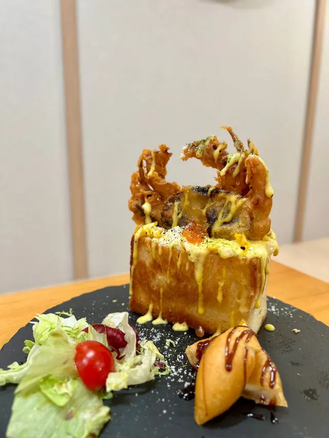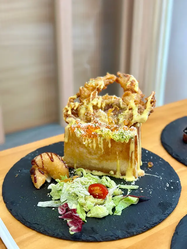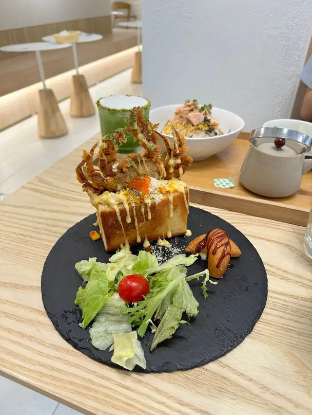 於香港大學站步行3分鐘即可到達餐廳裝潢以木系為主題🤎空間感十足,有榻榻米 🎎亦有露營主題區⛺️可以帶同毛孩一起打卡及享受美食🐾🔸E FOR EGG芝士奶蓋招牌窩夫 $88窩夫外型可愛,上面有迷你鷄蛋造型的cream🍳滿滿的奶蓋覆蓋整個窩夫🧇上面仲灑滿朱古力粉🍫窩夫烘得鬆脆,內裡有煙韌的麻糬🤍鹹甜適中,每一口都充滿了幸福感。🔸金沙軟殼蟹三文魚籽海鮮沙律盒子吐司 $123吐司外型十分吸睛👀大大隻軟殼蟹炸得脆卜卜🦀吐司亦烘得外脆内軟🍞配上鹹香味十足的三文魚籽及惹味的蛋黃醬,裏面滿佈拉絲芝士🧀邪惡又滿足🤤伴碟更有日式芝士年糕呢🔸滿滿蟹籽甲羅燒茶漬丼 $148期間限定的蟹籽甲羅燒茶漬丼色香味俱全,蟹蓋上放滿了鮮甜的蟹肉🦀香濃的蟹膏、脆口的蟹籽,仲有蟹鉗😍再配上葱花、芝麻、紫菜、脆米等配料,加入茶後味道清香,食落口感非常豐富🔸小食拼盤 $58🥢芝土年糕外層炸酥脆,包著柔軟Q彈的芝土年糕🧀芝味十分濃郁🥢酥炸雞軟骨香脆可口🍗且帶有微微的咬勁,讓人忍不住一口接一口。🔸炭烤雞扒湯拉麵 $78拉麵的麵條Q彈🍜配料有栗米🌽海苔、竹筍、紫菜等等,湯底濃郁。大大塊雞扒配上照燒汁🐓內裡肉質鮮嫩多汁。 🔸雪の巴斯克軟心芝土蛋糕 期間限定 $62期間限定的雪の巴斯克軟心芝土蛋糕十分特別😍外面一層薄薄的麻糬皮🤍包裹著整個巴斯克軟心芝士蛋糕🧀芝士味道濃郁,與麻糬皮同食,口感煙韌軟糯👍🏻🔸招牌奶蓋咖啡 $48表面放上一隻用奶蓋製成的迷你雞蛋🍳呼應餐廳名🤣奶香味濃☕️咖啡味道濃郁而吾不會苦澀🔸開心果特調 $56以開心果、鮮奶、豆腐來調配,味道香濃的開心果💚加上口感順滑的鮮奶🥛再配上軟綿綿的豆腐,口感豐富,味道亦十分夾。杯邊還放滿開心果碎,增添口感。…查看更多