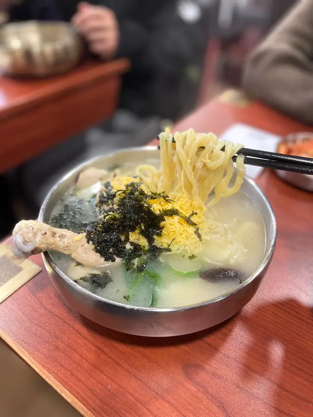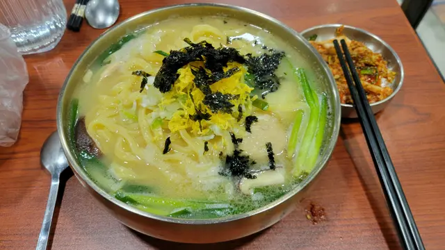 店在尖沙嘴山林道。小店一間,乾淨利落,桌距夠,坐得舒泰。午晚高峰常滿座,門口有人候位。服務員有禮,主動添水,上菜節奏穩。落座會先上泡菜。看得出是自家醃製,辣度輕,蝦醬帶出鮮味,灑上芝麻更香,單吃也不鹹。主打是自家刀削麵。我們點了牛骨湯和雞髀兩款。牛骨湯清而有味,牛香明顯,不覺負擔。雞髀刀削麵份量足,整隻雞髀躺在面上,再配一大顆馬鈴薯。湯頭較濃,鹹度比牛骨湯高一點,但沒有味精感,吃完不渴。麵條邊厚中薄,帶嚼勁,吸湯力好。小吃也有驚喜。五花肉泡菜煎餅厚薄適中,表面脆,裡面軟糯,咀嚼有層次。雙拼蒸餃子個頭很大,豬肉與泡菜各兩顆,餡料紮實,調味清,鮮味突出。整體價錢合理,份量實在。想吃一餐暖身、不花巧的韓式麵與點心,這裡可靠。…查看更多