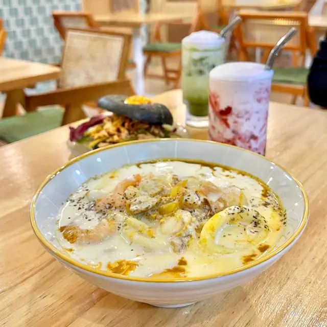 Cafe係走日台風小清新格調🤍木系裝修感覺非常舒服😌同朋友或者帶埋貓狗毛孩嚟hea就最啱🐶🐱.📌雲朵海鮮蟹黃咖喱烏冬 $128呢到係keto friendly 提供蒟蒻米同蒟蒻烏冬可以+$10轉👍🏻忌廉咖喱烏冬可能周圍都係 但係呢度好特別 個忌廉係加咗薯仔整 口感更加綿密 仲令烏冬更掛汁🥔不過個咖喱都幾辣 食唔到辣真係唔好嗌🍛🥵海鮮同麵底份量好多 有鮮蝦三隻🦐帆立貝同魷魚各五舊🦑真係兩個人share都夠👭🏻蝦好爽口好大隻 魷魚都好煙韌彈牙 帆立貝都好大粒🤩不過食落就唔多覺有蟹黃味 可以個咖喱太濃味🤣.📌BBQ醬燒雞配芝士醬貝果 $88呢個貝果份量都相當驚人😂貝果大個🥯雞扒厚身🐔拉絲芝士海量🧀雞扒都幾滑唔會好鞋 加埋個bbq醬 就係厚切版嘅板燒雞腿包🍗芝士一上枱已經聞到陣鹹香味 但食落唔會好鹹好濃味好滯 主要都係重奶味嘅mozzarella為主 面頭再加鹹香芝士醬🧡💛貝果嘅口感就差啲 冇烘過 成個都係軟身嘅 似係帶點煙韌度嘅麵包🙈旁邊仲有啲沙律菜🥗加埋晒所有野夾埋佢 就變左好豐富嘅貝果漢堡🍔撇除bagel嘅口感 呢個價錢嚟講 堅高質‼️.📌自家製蘋果玫瑰香蜜 $48飲落似蜜糖水 幾清甜🍯蜜糖都多 自己泡左少少水落去都夠味🤫但玫瑰嘅花香同埋蘋果嘅果味 就唔太出🌹🍎…查看更多
