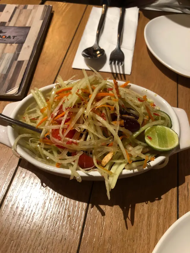 好耐冇食過泰國野,就同friend黎左呢間木船食飯。呢間餐廳環境好靚,用木黎佈置,襯番木船個名。一開始叫左個青木瓜沙律,味道酸酸甜甜咁,十分開胃。份量都好多,應該夠3個人以上食。跟住叫左個串燒雞柳泰炒飯。呢到嘅炒飯真係好好食,炒飯好香,鹹淡適中入面仲有啲類似豬肉乾嘅肉粒。而雞柳串都好香,仲有沙嗲汁可以點黎食。最後就叫左個酸辣明爐烏頭。雖然叫酸辣,但其實唔係好辣,只有少少辣味,岩晒我呢啲唔係好食得辣嘅人。個湯汁都係酸酸地,好易入口。入面仲有磨菇點綴。而烏頭方面,烏頭肉質鮮甜,魚肉都好多,又唔會好多骨,值得一試。我地都叫左兩杯野飲,一杯係鮮柚子沙冰,另一杯就係叫泰公主。鮮柚子沙冰有好多新鮮柚子果肉,飲品幾甜,唔會好酸。而泰公主就會較酸,入面都有士多啤梨果肉…查看更多