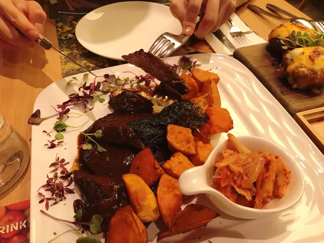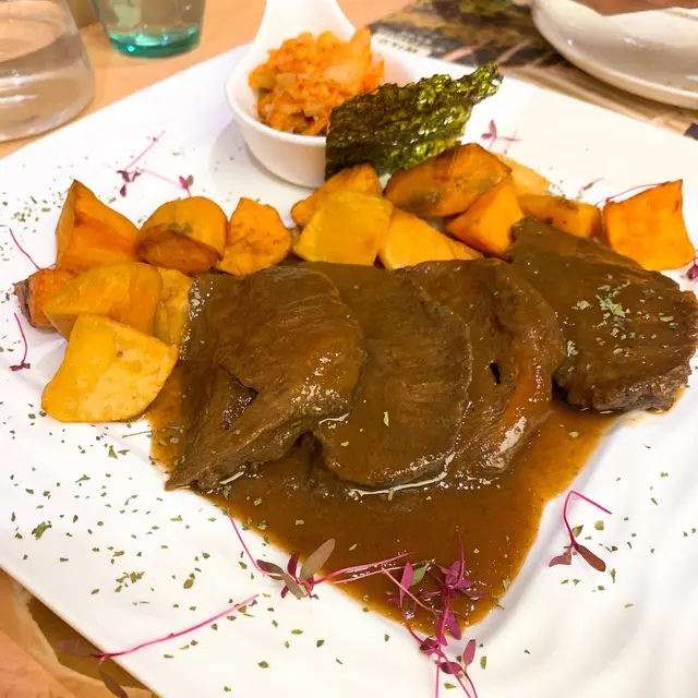 同朋友去左k11行街,幾鍾意呢個商場成日有好多有創意既商鋪進駐,帶比我好多驚喜。今次黎到,比我發現左一間無論裝修同食物質素,都好有誠意既餐廳,野玩田店。呢間餐廳主要係食西式料理為主,用左超級食物作為主題,加入去到菜式入面,好睇好食又健康。今次我地叫左四樣菜式,分別係「慢煮美國雞胸水耕菜沙律配白果醋 」,「黑松露片炒農場雞蛋酥盒」,「韓式和牛面配韓式牛肉汁」同埋「蟹肉美國露筍闊條手造意大利麵」。1.慢煮美國雞胸水耕菜沙律配白果醋 ($138)Hydroponic garden salad with slow-cooked chicken當行入餐廳時,留意到門口位置,牆身放左一個三層既花圃,種滿好多新鮮既植物,不同既蔬菜同香草,不禁令人覺得一定要叫道新鮮沙律食吧!叫左道慢煮美國雞胸水耕菜沙律配白果醋,上菜時比個份量嚇一嚇,因為道沙律好大盤,生菜非常新鮮而且好大塊,多款生菜配椰子條同番茄仔,當以為生菜大塊會撐起令碟下空心,餐廳真係俾足料,而醬汁係另外裝起,係貼心服務,同埋醬汁酸酸地,好開胃,而慢煮既雞肉比較乾身,加上生菜同醬汁食會比較好入口。2.黑松露片炒農場雞蛋酥盒($95)Black truffle fried egg vol-au-vent就咁睇menu張相就比佢吸引左,黎到果然冇令我地失望啊,用左三個酥盒去裝滿炒雞蛋,外表相當精緻,而且一上菜就聞到一陣松露既香味,色香味具全,雞蛋炒得好滑,同黑松既比例剛剛好,唔會放得太多搶走左雞蛋既鮮味,而且配埋焗得酥脆既酥盒,兩種分別係滑嫩同香脆既口感令到層次好分明 又豐富左一道材料好簡單既菜式。3.韓式和牛面配韓式牛肉汁($348)Korean style wagyu cheek steak呢道菜係咁多道菜之中令我最欣賞既,菜式配料好簡單,只有泡菜同蕃薯作配,但好睇得出廚師係主菜上落左心思去煮,望落去以為好似普通牛扒咁,點知一切完放入口,感受到驚喜,估唔到可以整到件牛咁鮮嫩多汁,完全係唔需要點咀嚼就可以吞到,同埋個牛肉汁調較得非常不錯,個味道帶少甜,同呢幾塊煮得剛好既牛件好夾,又唔會搶去左牛既香味,不得不提既係佢既蕃薯焗得好好,準確咁控制到保持佢既水份,食落唔會乾涸,內裡又軟綿,建議先食牛既原味,再試下點個汁食,然後再試下加入泡菜去食,一次過滿足想試唔同層味既你。4.蟹肉美國露筍闊條手造意大利麵 ($178)Pappardelle with crab & U.S asparagus 見到餐單上分別有手工意粉同手工薄餅選擇,但因為我地兩個人食,手工薄餅份量多較大份,於是我地揀食意粉,一於試下佢地既水準。由於本身鍾情於闊條麵,所以揀左個廚師推介既蟹肉美國露筍闊條手造意大利麵。上菜時,意粉份量睇落剛剛好,一開始望落果醬汁好濃郁,完全都唔會水狀,當食落去唔會感覺到濟,意粉出奇地大塊,類似千層意大利麵大小,而且好質地好軟熟,唔似係平時食慣既質地,可能就因為新鮮製作,每一塊都可以點到更多醬汁。鮮甜既蟹肉,連同新鮮既露筍一齊食,食都一口接一口,好食到差d想叫多份。我地兩個人叫左四道菜,四道菜都好滿意,都食到抱住個肚走,餐牌上其他菜式都好吸引,想一一都試試,菜式上有充分考慮到營養均衡。餐廳座位幾多,裝修又有田園風格,光線充足。…查看更多