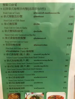 服務一般,唔係個個侍應都識落單,所以落單要嗌好耐。平日都超級旺場,所以上菜上野飲都要啲時間。坐都好迫,八個人坐六人枱,中間加隔板。*泰式芒果沙冰 $28大杯又解辣,芒果香濃,沙冰細滑,冇啲奇怪大塊冰粒。*木瓜沙律 $55大份,青木瓜爽脆,加埋脆花生同番茄仔,又辣又fresh。生菜唔係好新鮮,包住木瓜絲食,另有一番風味。泰式炒金邊粉 $58金邊粉唔會好油,乾身但好張口,而且偏甜,甜得嚟又有啲死甜嘅感覺。配料有炒蛋雞肉豆乾,同埋花生碎,可惜冇生芽菜同白砂糖,好似就唔多正宗喇。馬拉盞炒通菜 $59少少辣,但好油,惹味,但都唔夠馬拉盞蝦醬味,勝在大份抵食。馬拉盞炒椰菜苗 $68同樣惹味但偏油,椰菜苗比通菜更好食,可能因為多咗個有咬口嘅菜梗。串燒 (雞) (豬) $15燒得好靚,雞同豬都入味,肉質唔會腍晒,有少少韌,唔洗點沙嗲醬都已經好好食。檸檬燒牛肉 $123燒牛肉原本係好生,落單嘅時候叫佢燒熟啲,而家熟度啱啱好五成熟,唔會太韌,牛肉味差啲,不過好香蒜頭味,檸檬味反而弱啲,少少酸味開胃,又會令人一啖接一啖咁食。鹽燒盲鰽 $119盲鰽外皮脆但全部都係粗鹽,一定唔會食塊魚皮,魚肉嫩滑,肉多骨少,啖啖肉,不停夾,係差在唔夠鮮味,仲有泰式酸辣汁可以點。椰青焗咖哩海鮮 $138咖哩聞起嚟唔係特別香,食落好香好濃烈泰式咖哩味,椰汁就唔係特別強,有兩舊帶殼青口,蝦仁魷魚娃娃菜,仲有椰青肉絲,配蒜蓉包食好正*蒜蓉包 (5件) $26烘到好脆,單食有少少乾,點咖哩汁食就唔會太dry。…查看更多