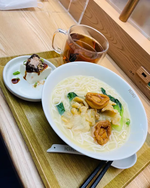 上星期六小女子約咗親戚去中環行街,順便食埋晚餐,所以就揀咗呢間KiKi麵店全日套餐 $148前菜煙燻無骨鳳爪鳳爪都幾爽口, 鹹鹹哋得黎又有少少辣,上面有白芝麻,食落更香口,下面又有青瓜絲襯托,估唔到呢個配搭都幾有驚喜🤤主食鮑魚花膠濃湯雞灌麵(要加$10)碗麵有兩隻鮑魚,兩塊花膠,鮑魚俾比我想像中大隻,花膠雖然唔算大塊,不過幾腍,而個湯底都幾濃郁,同個麵幾夾,小女子都忍唔住飲多幾啖湯🤭飲品白桃烏龍(熱)可能揀咗熱飲嘅關係,感覺比較甜,茶味唔太突出🙊整體嚟講,呢間餐廳價錢唔算平,但係食物質素都幾好,仲可以叫埋台式飲品添😆…查看更多