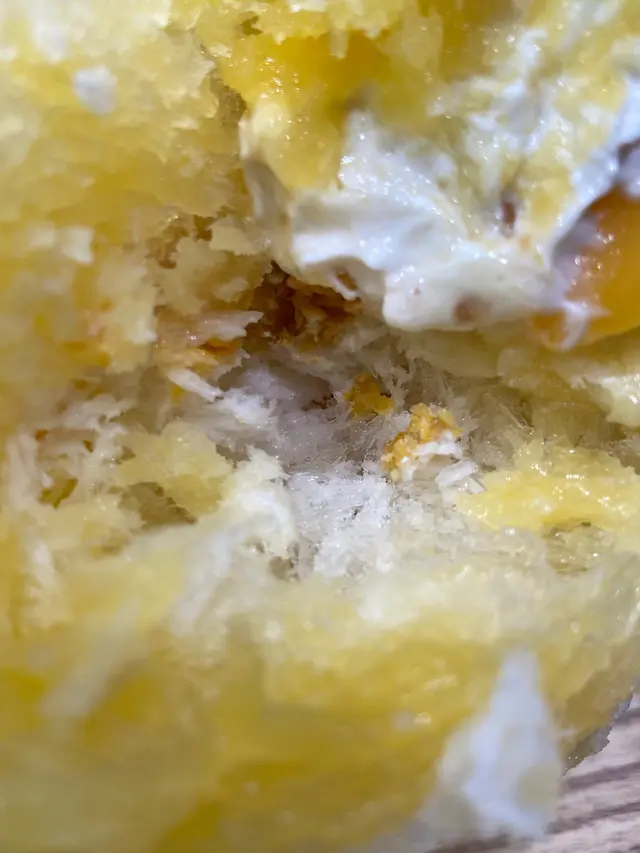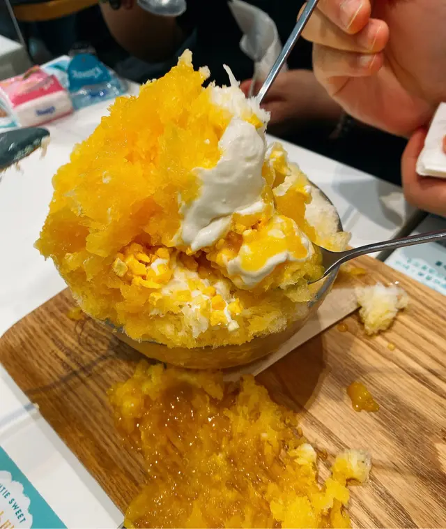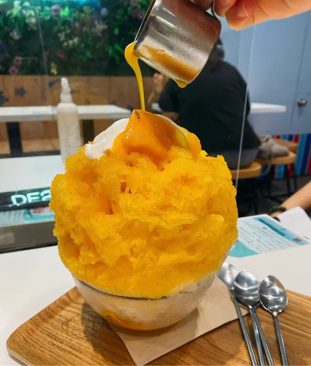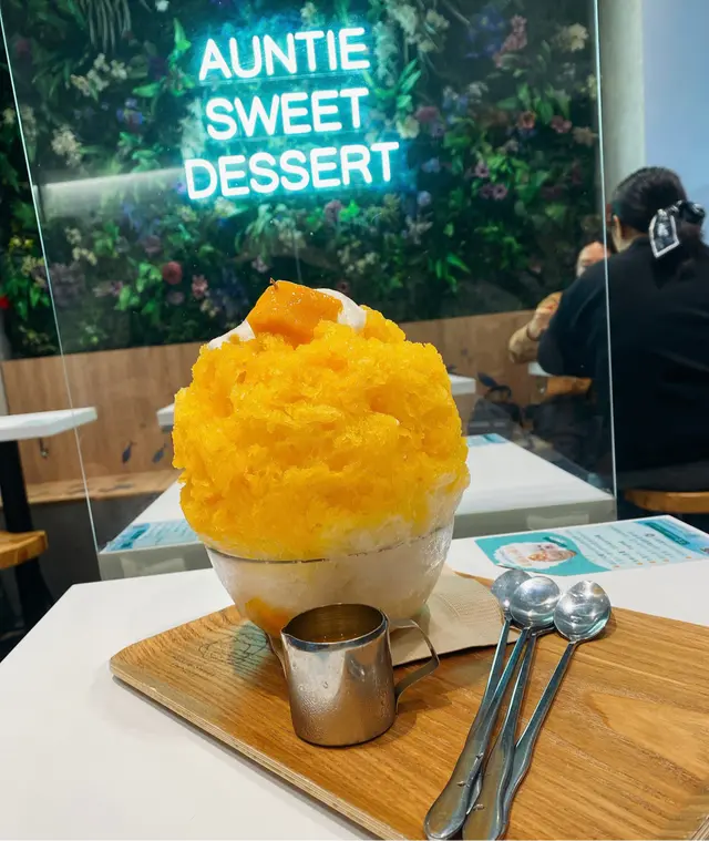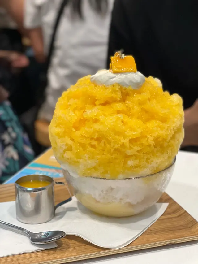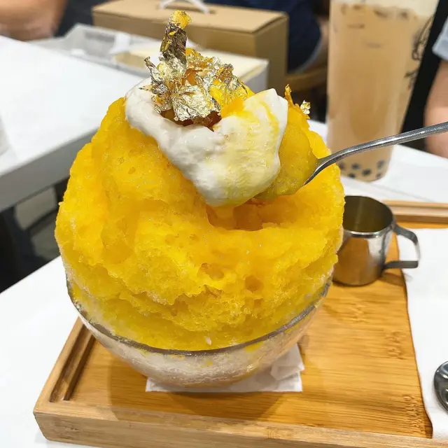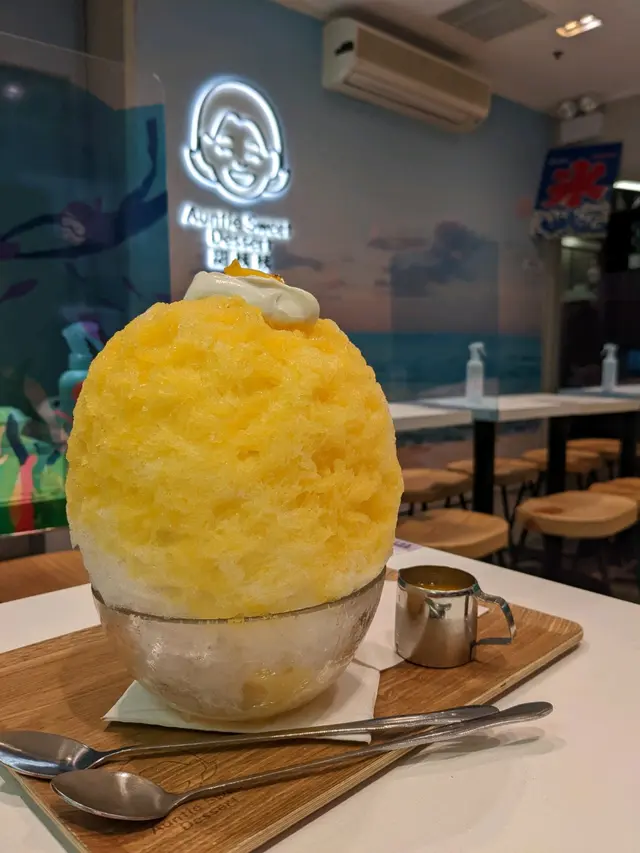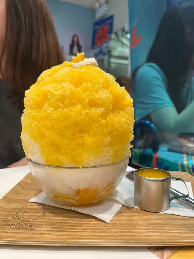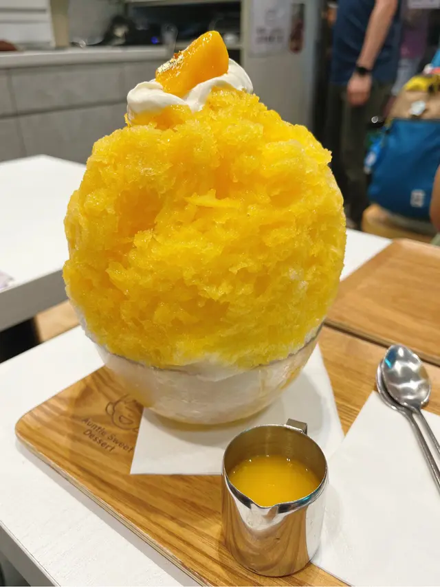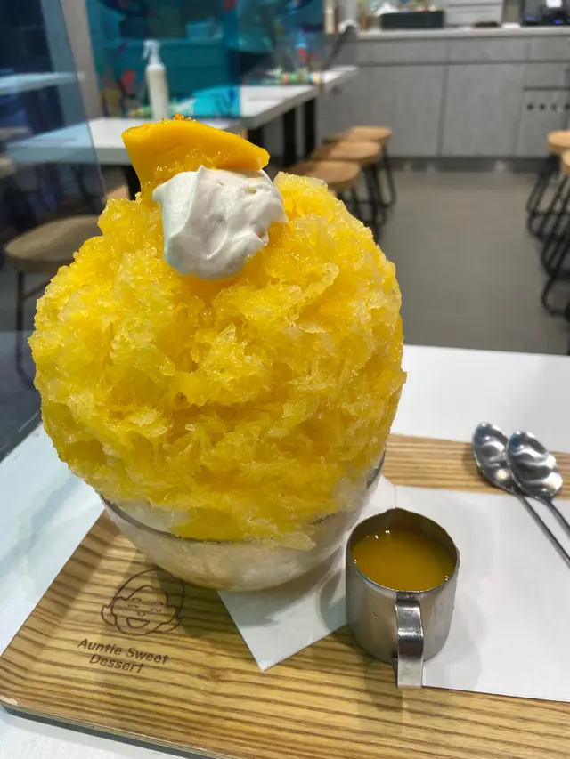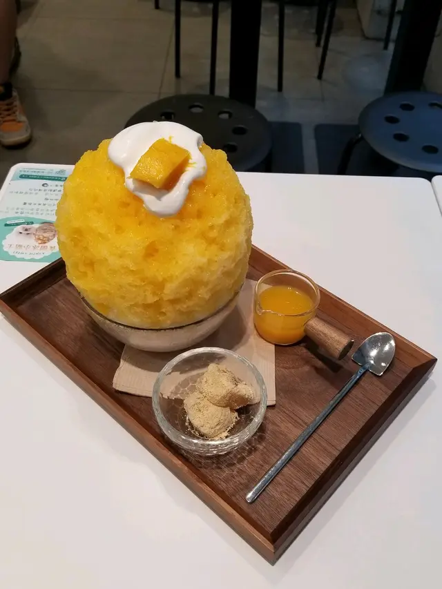 刨冰雖不利養生, 但對我而言是消暑佳品。因未嚐過甜姨姨的刨冰, 便特意前來一試。小店座位蠻多的枱面貼有"食刨冰小貼士"黃到金 $138甜姨姨的刨冰款式各有風格, 選擇困難症發作了一段時間, 最後選了黃到金。刨冰訂價$128-$148, 價格略為偏高, 對其期望亦相對增加。每份刨冰均配一份"刨冰buddy", 即2件蕨餅。蕨餅沾滿黃豆粉, 質感軟綿, 味道口感均不俗。黃到金主打菲律賓呂宋芒和楊枝甘露。刨冰賣相簡單, 滿是黃色的芒果味糖漿, 面頭有忌廉和一粒芒果以作點綴。起初以為黃到金是指芒果漿的顏色, 後來發現金應該是指放在芒果上的一片金箔。我怎樣看也不見有金箔, 罷了, 就當被風吹走。隨刨冰附上一小杯芒果漿, 讓客人需要時自行添加。吃一口刨冰便後悔了, 芒果漿味道不自然, 吃後即感惹痰。冰的質感不夠綿, 當中夾雜著冰粒。可幸的是, 吃到中段有芒果味的脆粒, 底有楊枝甘露, 芒果和芒果布甸, 口感豐富。刨冰溶化的速度快, 匙子小如茶匙, 吃冰還可以, 但冰溶後變糖水, 便要花長時間才可喝完。對我而言, 黃到金的外表和內裡的配料合符期望, 但訂價偏高, 而且吃後令人起痰的刨冰, 實在大打折扣。…查看更多