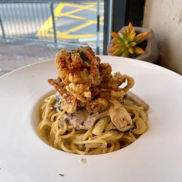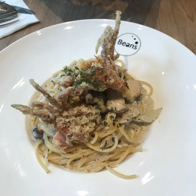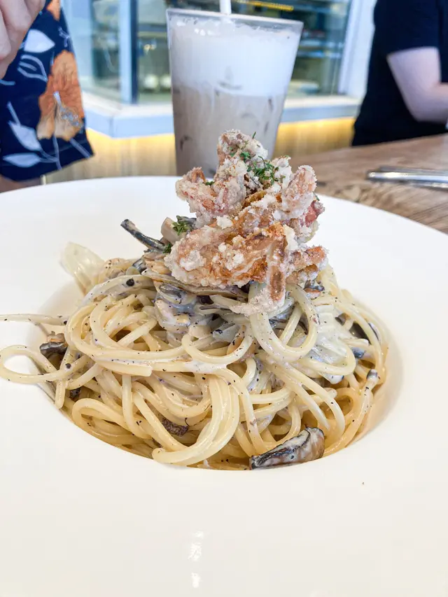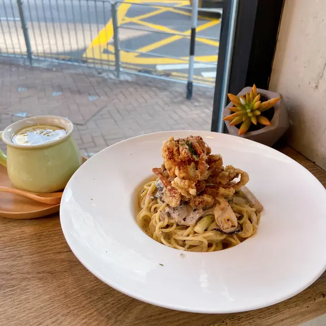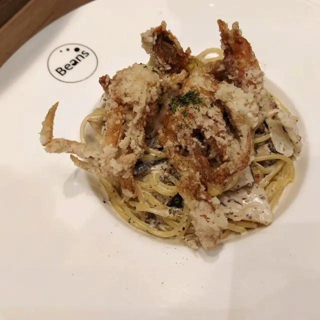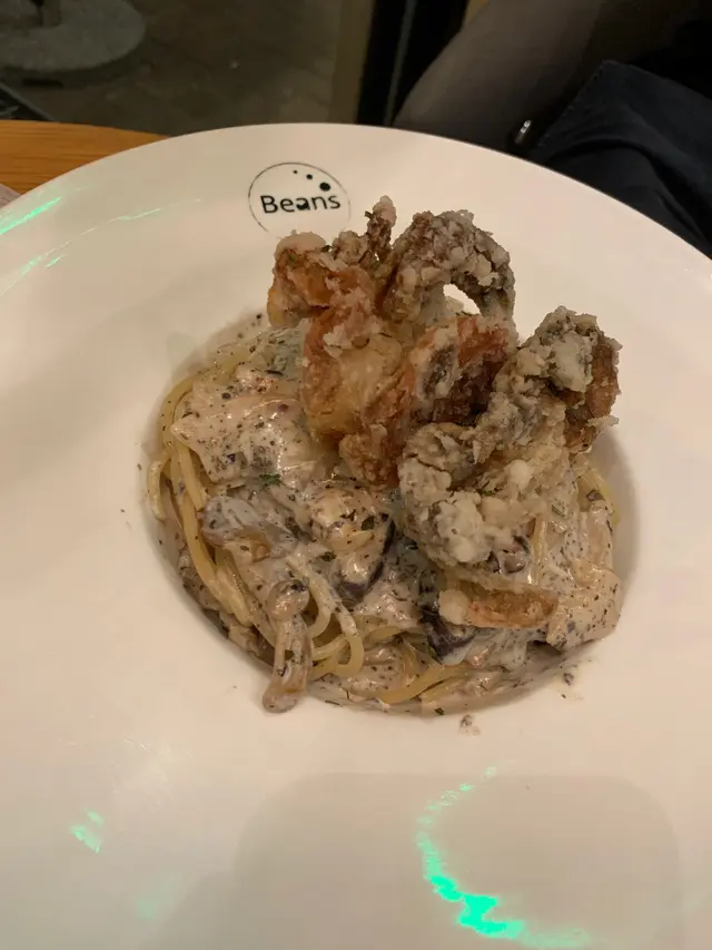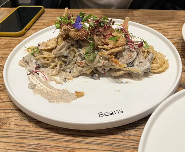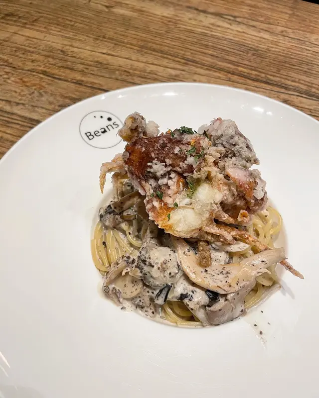 Beans 又係一間好出名但一直都未食嘅cafe,而且陸續開多咗分店,荃灣呢間係有2個鋪位,我哋星期五夜晚去,都要排一陣隊,排隊等緊都見好多枱都會叫埋甜品,但 7點幾入座,見蛋糕櫃都淨返較少選擇,睇嚟下次要晏晝嚟食埋啲蛋糕啦😛•🥢 黑松露軟殼蟹意大利粉 $98黑松露野菌汁份量好多,每條意粉都佔滿咗黑松露,所以每啖都好濃黑松露味!意粉係偏硬身,但可以接受,份量啱啱好,食完唔會太膩~軟殼蟹分開咗兩半,有少少細隻,但炸得好脆又唔會太油👍•🥢 開心果馬蘇里拉芝士薄餅配蜂蜜 $86呢個薄餅有少少厚度,不過都做到外脆內軟,批邊加咗啲砂糖,都令個批邊食落脆啲,中間部分就佈滿芝士,芝士味都幾濃,加咗開心果碎,但開心果味唔夠突出,比蜂蜜嘅香甜蓋過晒,係一個甜嘅pizza~•🥢 檸檬蜂蜜All day menu會跟一杯飲品,可以揀檸檬蜂蜜/黑糖薑母茶/普通裝美式咖啡,我揀咗熱檸檬蜂蜜,蜂蜜味同pizza配嘅一樣,有種好清香嘅花味,唔會死甜,飲落都幾潤😌…查看更多