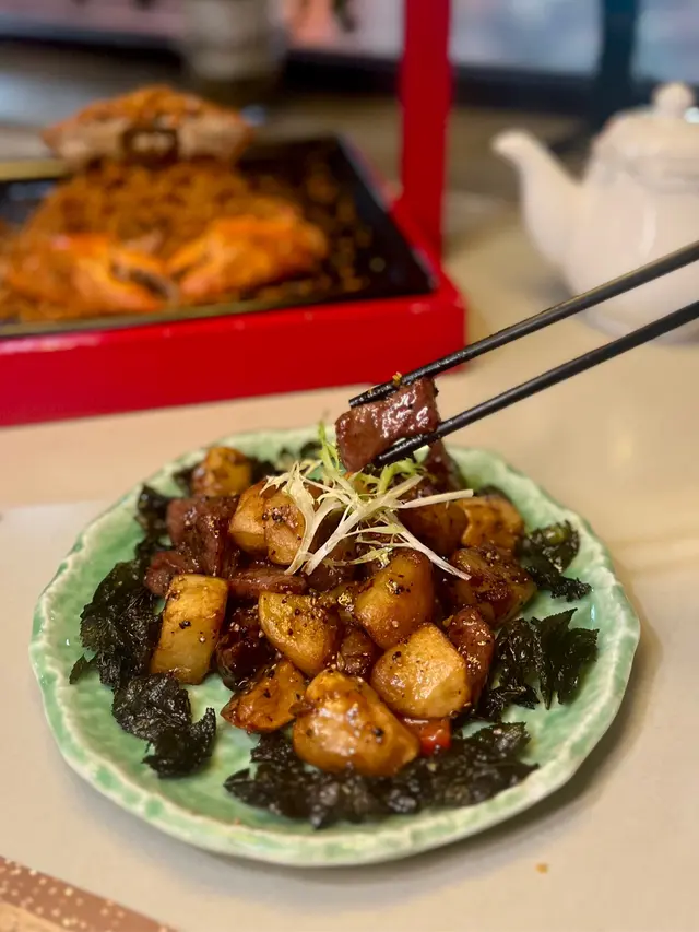 今晚特登同朋友去左網紅蟹店食蟹,天花板掛住中式燈籠,燈光柔和,古色古香有特色。宜家仲做緊優惠,指定菜式半價,每月會更新優惠菜式,炒蟹都有8折優惠。避風塘炒蟹一定要點嘅菜式,用左新鮮肉蟹,肉質鮮甜彈牙,加上特製炸蒜、香蔥和紅辣椒爆炒,每一口蟹肉都吸收左炒料嘅香氣,沾滿濃郁嘅鹹鮮滋味。黃金流沙蝦球大大隻蝦球沾滿左鹹蛋黃粉炸至金黃色,外皮酥脆,蝦肉柔軟多汁,入口鮮甜,鹹香濃郁。黑椒牛仔粒牛肉粒口感軟嫩帶有微彈,肉味濃郁,帶有黑椒嘅辛辣香氣,薯仔粒入口有黑椒微辣味,口感軟綿綿。京燒蟹肉粉絲透明細緻嘅粉絲吸收左蟹肉鮮味,口感彈牙細滑,仲加左蛋絲一齊炒,份量好足。…查看更多