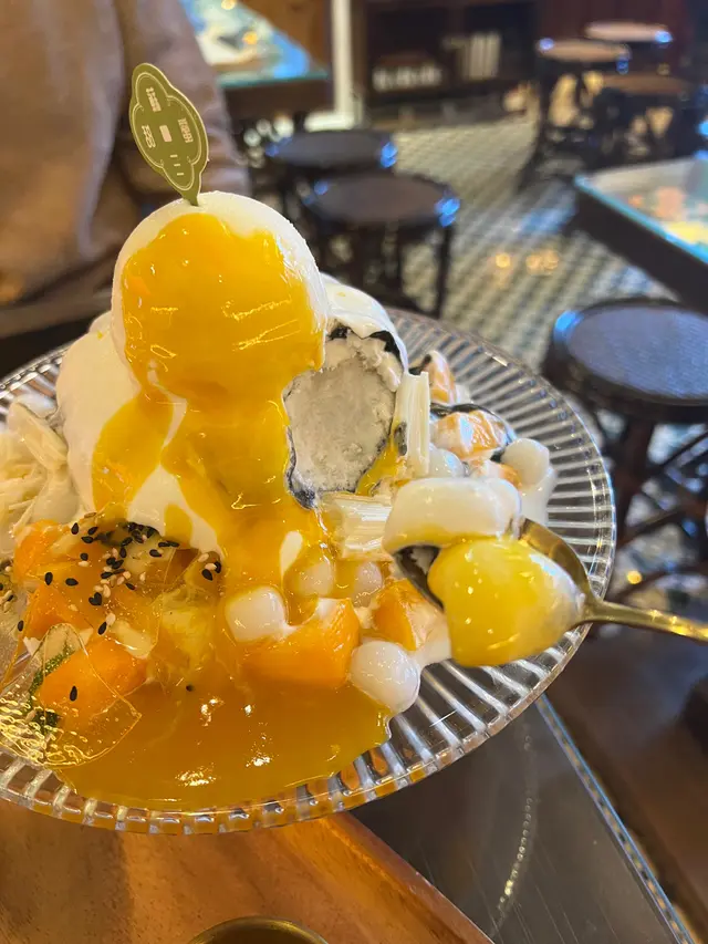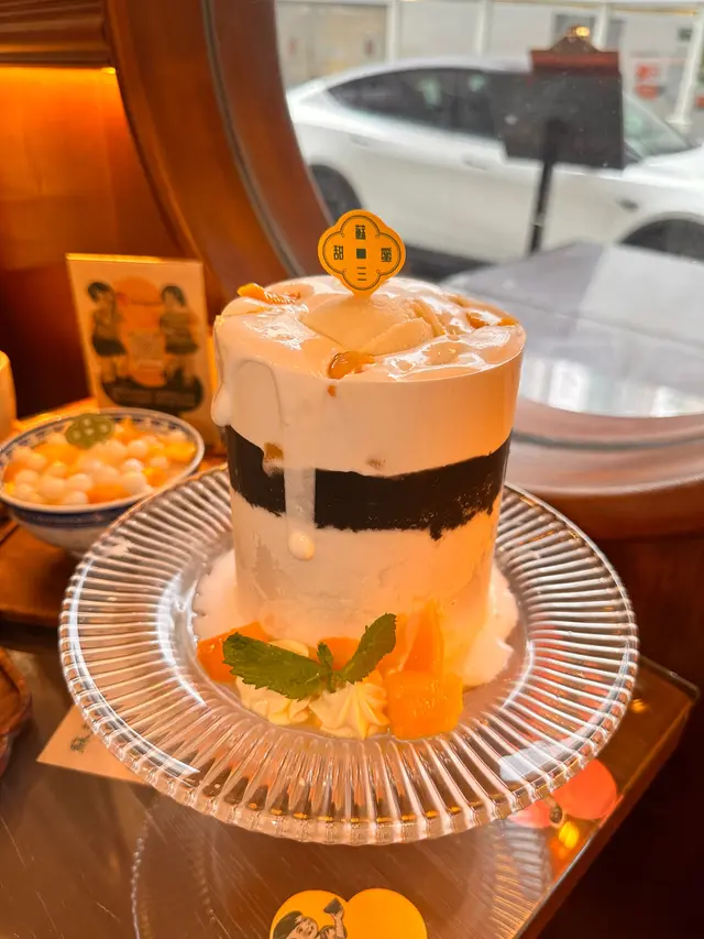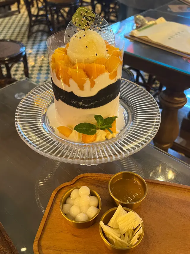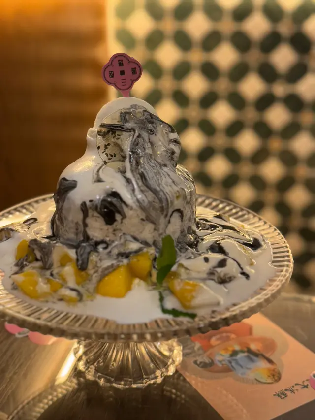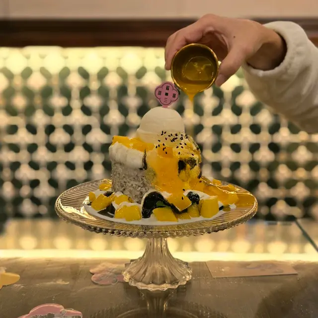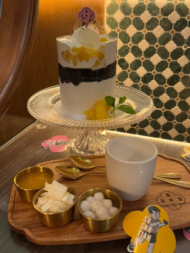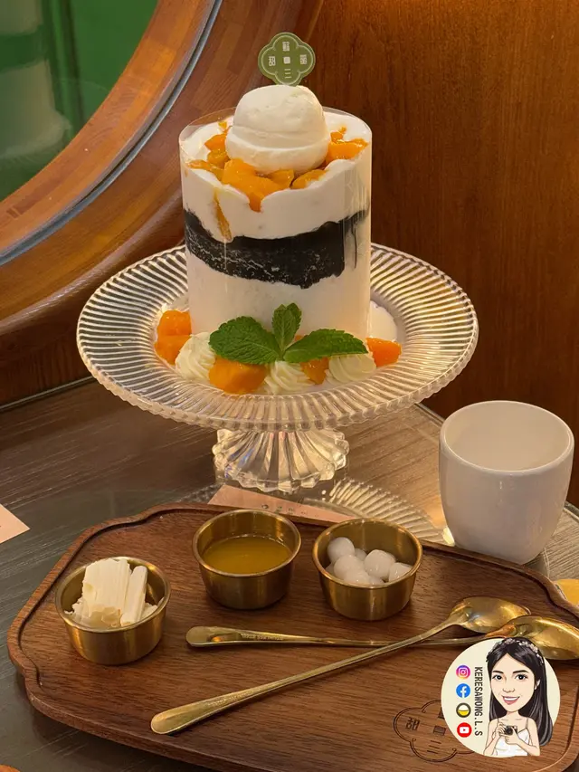 有特色又可以打卡的甜品店其實真的不多,來到裝潢很有特色的〔蘇三甜蜜〕甜品店,一到店鋪門外已經很有懷舊風味,深木色的花形木窗框及木門框,一進店內更彷彿去到60、70年代,綠色吊燈罩、圓枱木凳、格仔地磚等、都散發着復古懷舊的年代感。店內除了有不少傳統中式甜品外,亦有創出不少自家製的特色Fusion甜品,賣相吸睛亦很適合打卡。【茅台朱古力布丁】(HK$58)店中招牌特色甜品之一,將中式茅台酒跟朱古力布丁結合,布丁上的朱古力牌還模仿了茅台酒瓶顏色標誌,再加入自家設計而做成,入口布丁質地滑溜,帶有酒香及濃郁的朱古力味道,中西合璧很有驚喜。【芒果小丸子芝士布丁】(HK$55)小丸子跟芒果份量很多,布丁質感幼滑,加上煙靭的小丸子及芒果,酸甜適中很清新,飽腹感亦十足。【黑芝麻芒果冰蘇】(HK$128)近年都比較流行這款瀑布造型的甜品,把綿綿刨冰堆成蛋糕圓筒形狀,用了透明封膜作固定,當把膠膜拉走一刻,猶如瀑布傾瀉而下,場面非常治癒又澎湃,整個碟都是滿滿的冰蘇(刨冰),冰蘇入口即融,配上頂部的雲呢拿雪糕及中間的黑芝麻醬、額外配備糖葱、芒果汁及小丸子等配料,可以隨意加入,口感層次很豐富,涼快可口,作為甜品亦不會覺得太甜膩。…查看更多