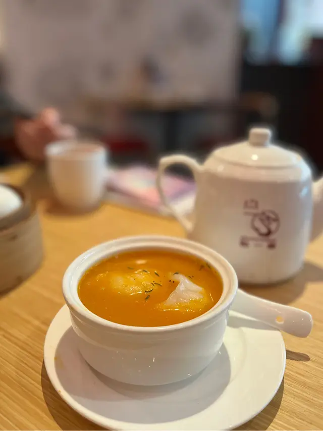 臨近年尾去商場血拼,行到攰搵個地方嘆個下午茶,見佢d點心價錢唔算貴就試下~幾鍾意店內呢盞超大既紅色水晶吊燈,有中式味道又唔會太古板。先黎上左個雪影叉燒包,麵包皮唔會太厚,微甜既雪山外層鬆脆,同入面咸香既叉燒餡好夾。整個都算係幾好食,係可惜唔夠熱度,如果剛出爐咁會超正!另一樣叫左龍蝦湯三皇餃,係店外已經俾menu張圖吸引到。好似灌湯餃咁上法,不過入面係兩隻蝦餃咁既蒸餃。夾起既時候餃皮個底已經浸到淋晒,一夾就爛開...至於個餡,食落爽口唔錯既,不過係邊「三皇」就食唔出~menu仲有一款個名同賣相都好特別既「牛肉手袋」,外樣似蘿蔔絲酥個種酥皮,不過厚身左少少,手袋入面「袋住」既係牛肉碎粒。賣相的確好得意,可惜焗得d牛肉太老太鞋,食多兩啖個口仲好乾,冇咩肉汁keep到。以尖沙咀地段黎講,呢間點心性價比都算ok,食物水準就有改善空間,有機會都會想試下佢晚飯小菜睇睇~…查看更多