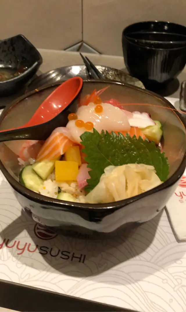 我地一人叫一個定食,我就叫左yuyu 雜錦魚生丼,跟餐有沙律同味噌湯,同事叫左魚生壽司5 件+ 牛肉蕎麥麵。上菜速度都快,5分鐘多啲就上前菜。Yuyu 什錦魚生丼