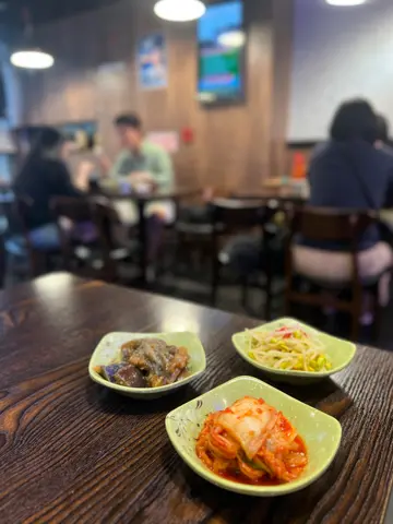 。点餐后,店员会奉上前菜,共有3款:白菜泡菜、芽菜和四季豆。