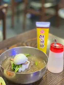 今晚点的都是笔者喜欢的韩食!水冷面份量都几大碗,附有半只鸡蛋、青瓜条和白萝卜条作配菜。荞麦面条幼细,带著烟韧Q弹口感