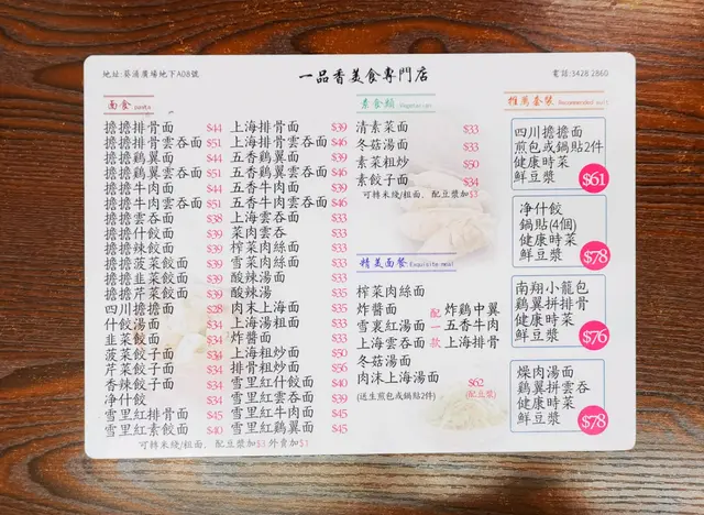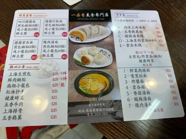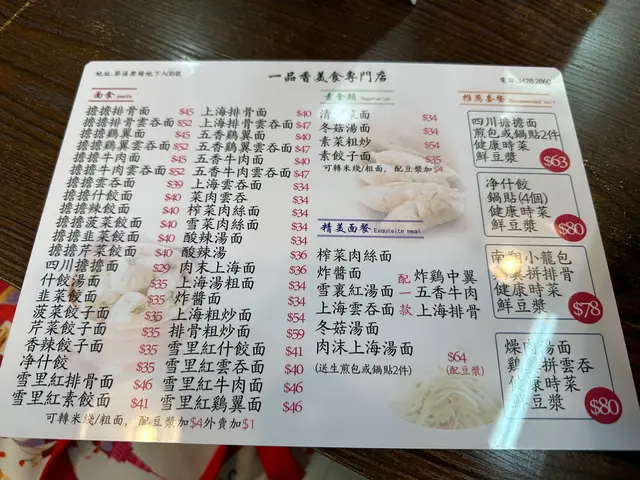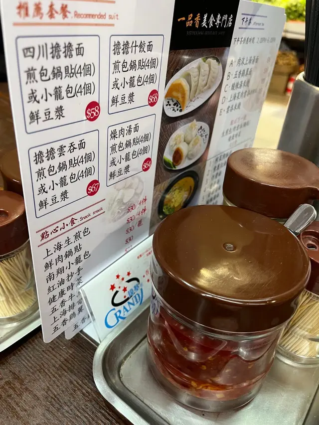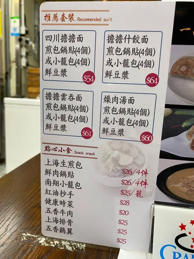 葵廣呢間上海菜小店,成日都經過,好多時都有一班食客,但一直都無諗過幫襯。是日去開葵芳,經過幾間餐廳都無乜意慾,去到呢間門口,不如就試吓你啦。精美麵餐($66)六選一麵食要咗炸醬麵,三選一肉類要咗上海排骨,二選一小食要咗鍋貼,送豆漿。炸醬麵有一咋醬汁冬菇豬肉碎,調味還可以。上海麵份量足,唔算好糊丁丁咬口。湯底接近清水無咩味。上海排骨有四件,即炸夠熱,頗厚身,無骨啖啖肉,肉質偏實,味道一般。鍋貼(2隻)係熱爐拎出嚟,但唔太熱,所以唔夠香口,皮偏糊口,餡料滿滿的豬肉碎。豆漿,味道偏甜。推薦套餐($67)擔擔雲吞麵,擔擔醬唔得,淨係得花生醬味,仲要唔夠濃郁。湯底同樣清淡無味。四隻雲吞大隻,餃皮正常,餡料滿滿的菜及豬肉碎。呢碗嘅上海麵可能煮耐咗,所以口感糊咗啲。小籠包(4個),唔係平時食開嗰款,皮薄,肉餡超多超滿,但無肉汁,似食緊粒大版嘅乾蒸燒賣。豆漿,味道偏甜。PS:今日食嘅鍋貼、雲吞、小籠包,餡料都係同一隻味道嘅豬肉碎,估計生煎包、紅油抄手應該都一樣。老實講,唔難食但絕對唔係好食。份量足,夠哂飽肚,價錢公道,但味道一般,可惜應該沒有下次。…查看更多