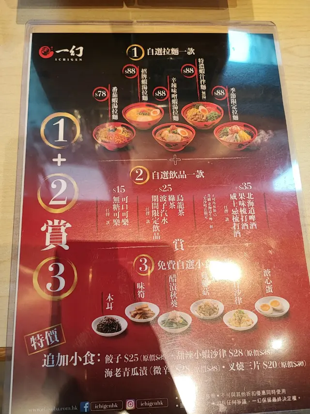 一早十幾日前已經約定今晚去一幻係佢331搬鋪前試下佢蝦湯拉麵兼且第2碗半價。平日差唔多9點度仲要大道東真係冇咩人,得2個客食緊,所以唔使等輕鬆任坐。4人坐位其實唔多,多數都平排位,想傾住計食都真係睇運數,唔知佢遲啲搬去世貿商場鋪會唔會唔同,多番啲對坐既位。枱上有水有杯提供,筷子紙巾都齊全。侍應都有時間介紹下我地點樣點菜同推介啲套餐。我地3個人所以叫左3個有飲品同小食既套餐,3個都蝦湯麵,另外叫一個叉燒拌麵。3樣小食要左薯仔沙律,木耳同埋筍,3樣都好食,而且冇辣味岩晒我呢啲唔食辣既人。薯仔沙律上面有啲粉紅色既卜卜脆既粒粒但好夾好食,學啲韓國飲食節目咁講,有食感唔會純沙律糊係個口咁。木耳同筍咸淡都岩岩好,作為醒胃小食真係值得推介。我試左鹽味全蝦湯幼麵。湯味都夠晒濃,蝦味夠突出,而且其他特殊味道。證明呢煲湯既蝦都夠新鮮。麵條爽口又彈牙,150G份量亦都幾多,我呢啲重量級既人都覺得食極都好似仲有咁,當然仲有個叉燒拌麵,粒垃叉燒夠晒咸味入味,一定要配住麵食咁就岩岩好,否則單食一粒有些人可能會覺得偏咸啊。最後個支要成個套餐加35蚊既靜岡柑橘梳打真係好飲(可樂+15),覺得呢個35蚊呢支梳打值回票價。唔會太甜,而且柑橘味好香,你慢慢飲完一啖都會好想一放低又要拎番起佢再飲。最後一樣就係今晚食好彩係唔需要飲大量既水,飲支果汁足夠清除你覺得口渴既,因為驚萬一個湯底唔靚就要係咁飲水,發現自己成晚食住碗湯麵同拌麵都只係飲過一次水,因為食湯麵後中途食第一口拌麵個陣想過左湯麵既味試個拌麵,之後食完晒先至飲支果汁梳打。希望佢搬去世貿後都保持水準。…查看更多