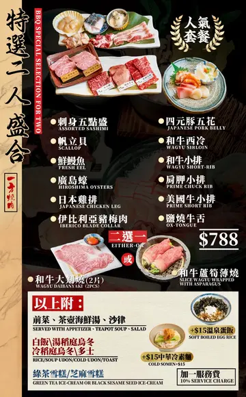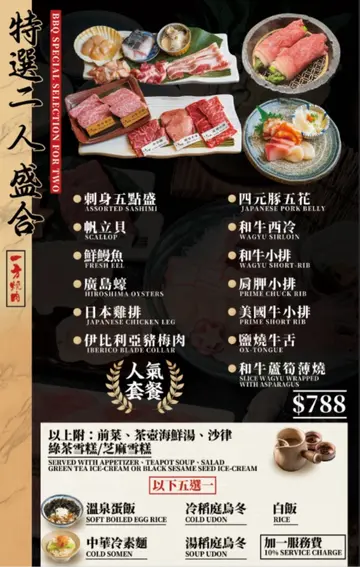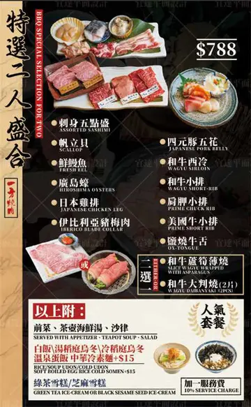 🔥大角咀利奥坊一方烧肉,食过三、四次,系贪新鲜、钟意试新嘢嘅我,少数会encore再encore嘅餐厅。楼底高、啲位超级阔落、仲有他他咪独立房。星期一至四嘅自选一人前由我第一次食$148加到$178,但依然好抵食。我会拣+$30、$208自选「四𩠌」。🥩牛小排必选,好味过肩胛小排。每份有3件,牛小排其中一件切成厚切方块粒。超正。🦐海虾(1只)同🦪广岛蚝(3只)上次食过好好味,所以再encore。另外试咗鲜鳗鱼🪱同店员极力推介嘅🐖黑豚猪梅肉。🐷黑豚酸梅肉用甜面豉腌过,肉质爽弹,甜甜哋,真系冇介绍错😋出面食烧鳗鱼好贵,呢度嘅有少少泥味,但新鲜弹牙,配鳗鱼烧汁。呢间最劲系唔止肉类,连看似配角嘅海鲜都极高质。🐟另外加咗$118五点刺身,本身对烧肉店嘅刺身冇乜特别期望,以为只系畀客人多个选择,点知极度喜出望外,样样都厚切同非常新鲜。套餐仲包沙律、中华沙律、面豉汤、蔬菜盘、饭或乌冬(呢度嘅冻乌冬都好好味)同维记雪米糍。最惊喜系送烧鳕鱼干(之前食冇、居酒屋叫一碟都唔平)。🔥炉靓火靓网靓,真心啲肉点烧都有靓仔格仔纹🥓抽风好,食完件衫完全冇味。用咗openrice$50买$100券,一至五只限晚市,星期六日就全日。但只限用两张,如果食得好豪over$1000嘅,平时餐厅就咁九折仲抵。但最最最抵系星期六日嚟食lunch set+用券,更平,𠮶个和牛set真系物超所值。…查看更多