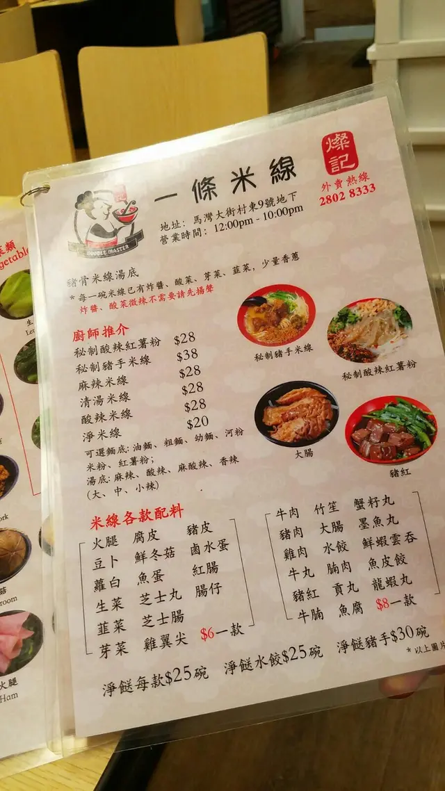 馬灣少有好餐廳,呢間主打酸辣米線嘅小店就係其一自己覺得佢最特別係一款秘製小食餐廳名一睇就知道係一間米線店實情就係主打酸辣米線各款米線介乎$28-$40,加配料每款$8以米線嚟講,價錢偏貴車仔麵款就$20平啲可以揀最直接嘅款式,不過兩個人埋單都要$90至$100秘製豬手米線 $40 一碗份量恰好豬手類似南乳豬手,好入味,醃得香濃豬皮入口柔滑重膠質,炆得好有軟糯感,中間帶爽口大概有5、6舊,2舊比較大,其他偏細舊米線不過不失,屬車仔麵質素,起碼即煮酸辣湯底挑選BB辣比較容易入口酸辣味唔太濃,尚算開胃每碗都有大量香蔥同炸蒜,色澤平均,幾香口牛筋腩麵 $40 比較遜色只係同坊間車仔麵比係優勝牛筋腩係軟嫩嘅,但食過豬手再食牛腩就會覺得失望,唔夠入味粗麵同樣係車仔麵質素湯底挑選中辣,已經好夠麻辣味係真材實料,只係辣油多咗啲查看更多