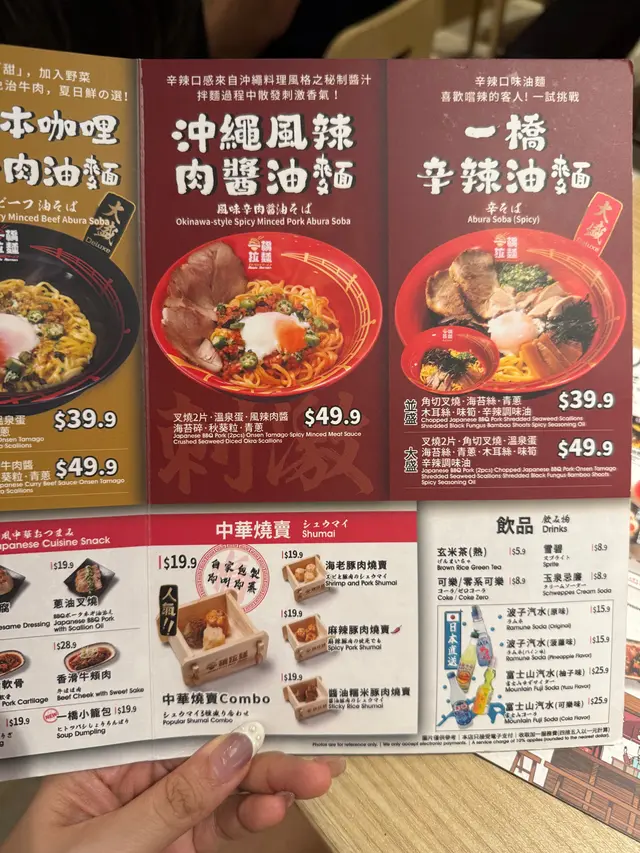 喺中環唔知食乜好行威靈頓街成條街望下有咩食見到這間拉麵店勁平就入去試一試都幾多人食不過好彩唔使等位二人餐138兩個麵+兩個小食+兩個嘢飲好似仲平過食茶餐廳主食沖繩風辣肉醬豚骨湯拉麵日本特製咖哩免治牛肉油麵(加大盛,無湯拌麵)小食中華燒賣Combo胡麻櫻花蝦秋葵飲品無糖可口可樂富士山可樂味汽水沖繩風辣肉醬豚骨湯拉麵麵條係一種幼麵風格,煙韌彈牙肉醬味味帶辣, 最好食係嗰兩隻溏心蛋吸曬湯咖哩免治牛肉油麵(大份量)小份量同大份量的分別係會多兩片叉燒,小份量的就冇兩片叉燒, 所以揀咗大份量麵質又烏冬又似港式油麵, 食落好煙韌彈牙 咖哩肉醬撈油麵 ,好有港式嘅風味中華燒賣Combo味道好多元化, 冇諗過糯米包咁樣嘅燒賣我自己覺得最好食係麻辣豬肉燒賣,少少麻辣食到豬肉香味胡麻櫻花蝦秋葵口感清爽, 非常足夠的胡麻醬無糖可口可樂同富士山頂可樂汽水富士山汽水感覺係似可樂味汽水今次試新嘢,兩碗麵都加咗錢同叫咗特色飲品兩個人埋單唔使200蚊, 仲要喺中環,非常抵食…查看更多