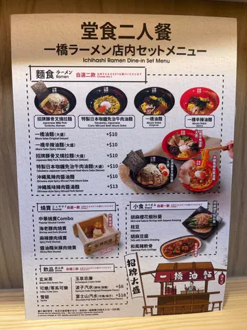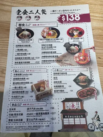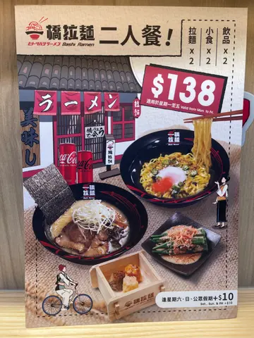 二人餐失望之选放工突然好想食拉面,见到新开张,抱住试新嘢嘅心态,我哋喺荃新天地试咗一桥拉面嘅二人餐($138),结果几失望。🍜 招牌豚骨叉烧拉面:汤底唔够浓郁,叉烧冇咩味,冇蛋已经扣分,拉面亦唔够弹牙,整体冇惊喜。🌶️ 海老浓汤叉烧拉面:味道偏辣,但餐牌完全冇标示,对唔食辣嘅人嚟讲真系唔太友善。配菜小食都系一般,冇特别。以差唔多价钱,荃新天地另一间拉面明显好食好多。整体食物质素非常一般,唔会再回头。