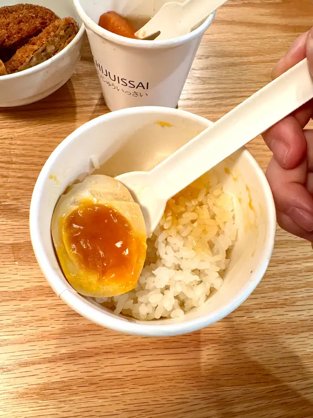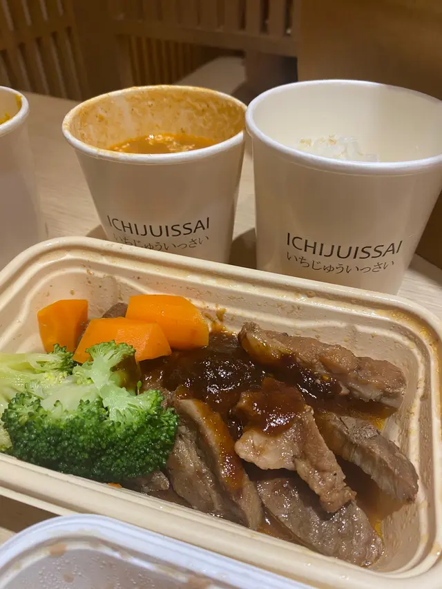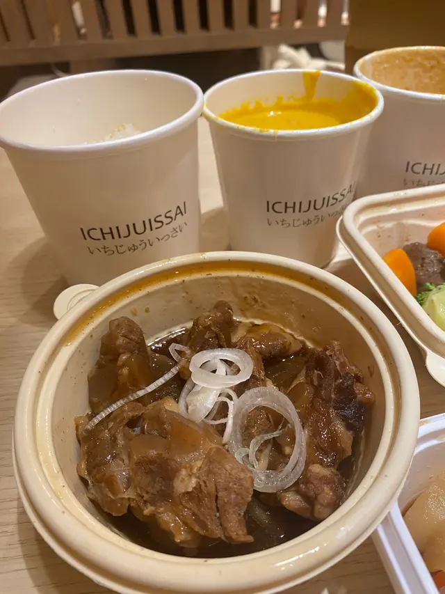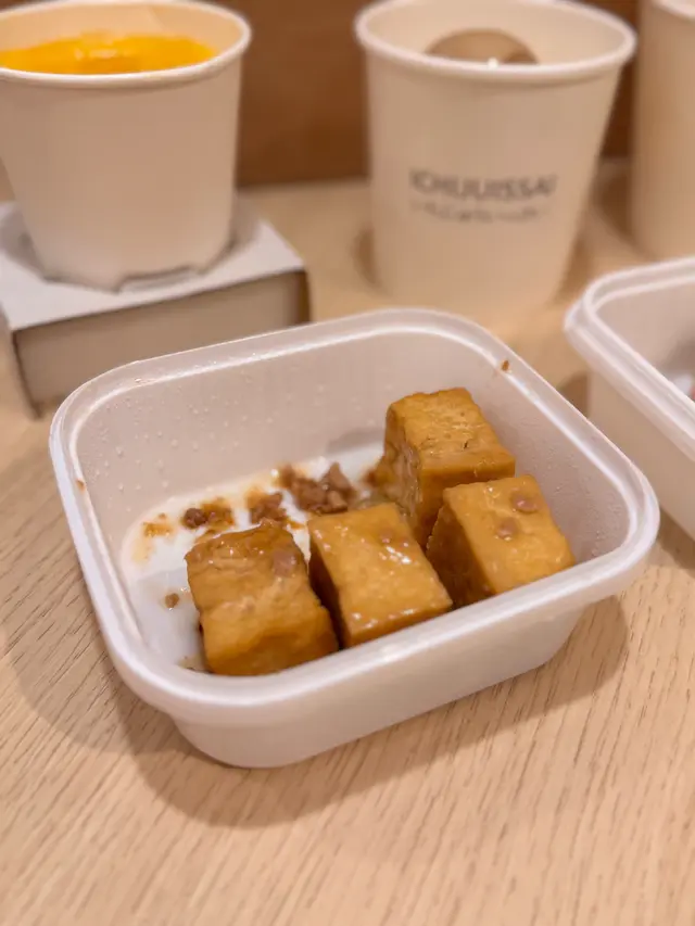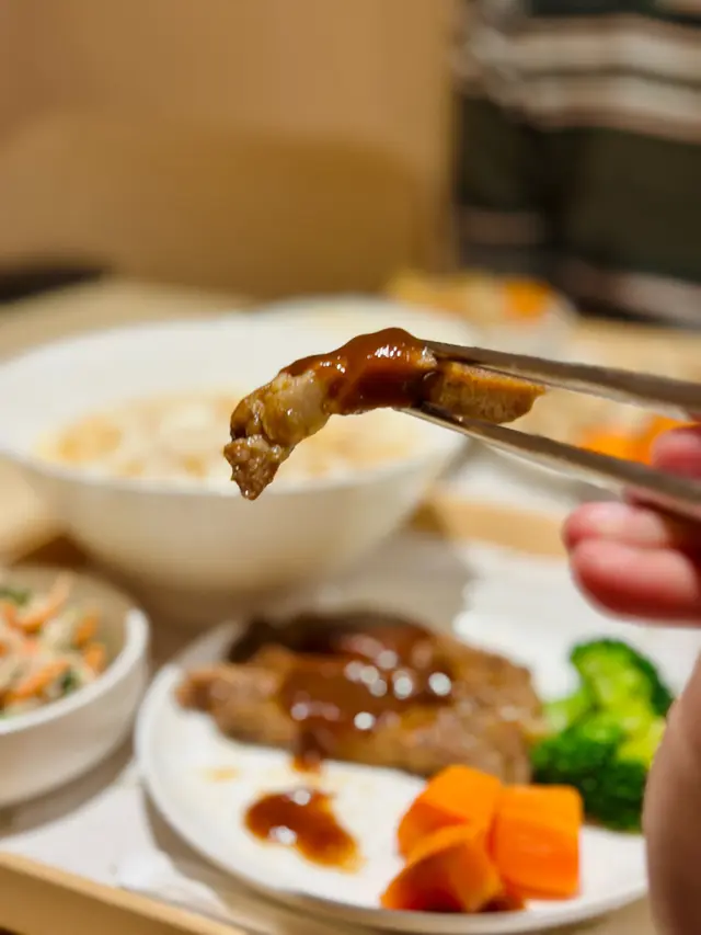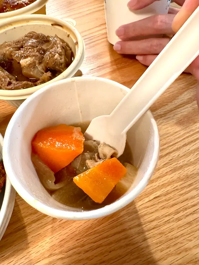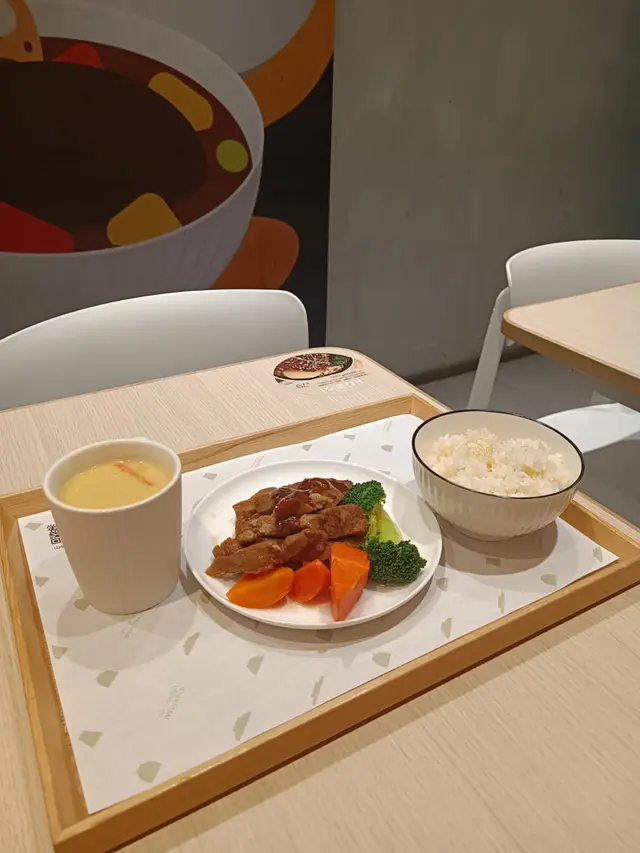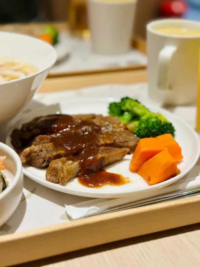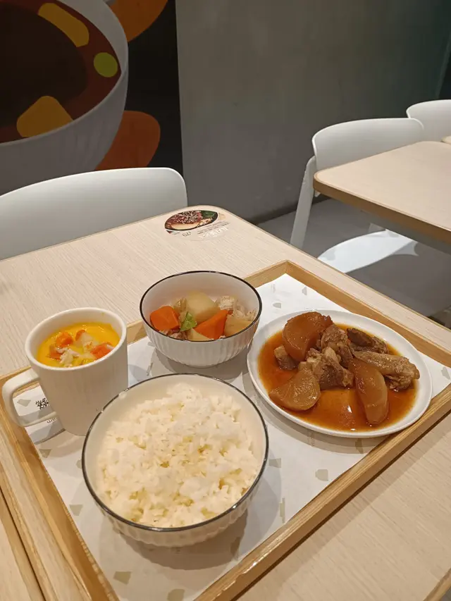 這道雞扒以豆乳和味噌調味,豆乳的滑順和味噌的鹹香,配上雞扒有種奶油味。配菜是日本馬鈴薯豚肉煮馬鈴薯和豚肉煮在一起,薯仔吸收了豚肉的汁水,入味十足,豚肉則不會過老,保持了適當的口感,還有芋絲吸收醬汁精華,這道配菜簡單卻充滿日式家庭菜餚的溫暖感。店舖使用田牧越光米,飯粒清晰,口感軟糯。飲品:蜜桃紅茶(凍)