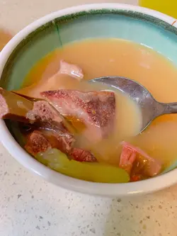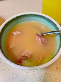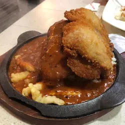 经过凤攸南街,会有一间茶餐厅,招牌是一个七彩颜色、闪下闪下,写住「一蒲点」的招牌,入面的价格也相当平民,一个铁板餐连冻饮都只是五十多元,呢日,我们便选了「一蒲点」店员有一个小窝心的举动:一坐下,店员便递上两杯暖水,友人习惯会把需要用的餐具放到茶杯内浸一浸,之后我咳左数下,店员便递上新的两杯水,感谢我选了铁板餐:吉列猪扒配鸡翼、薯菜友人选了咖哩猪颈肉饭友人叫的猪颈肉饭,奉送例汤都有好多料下
