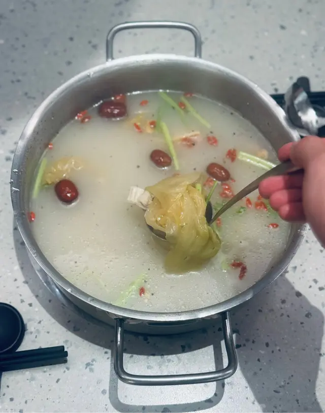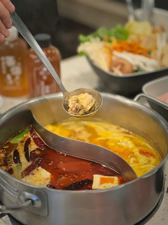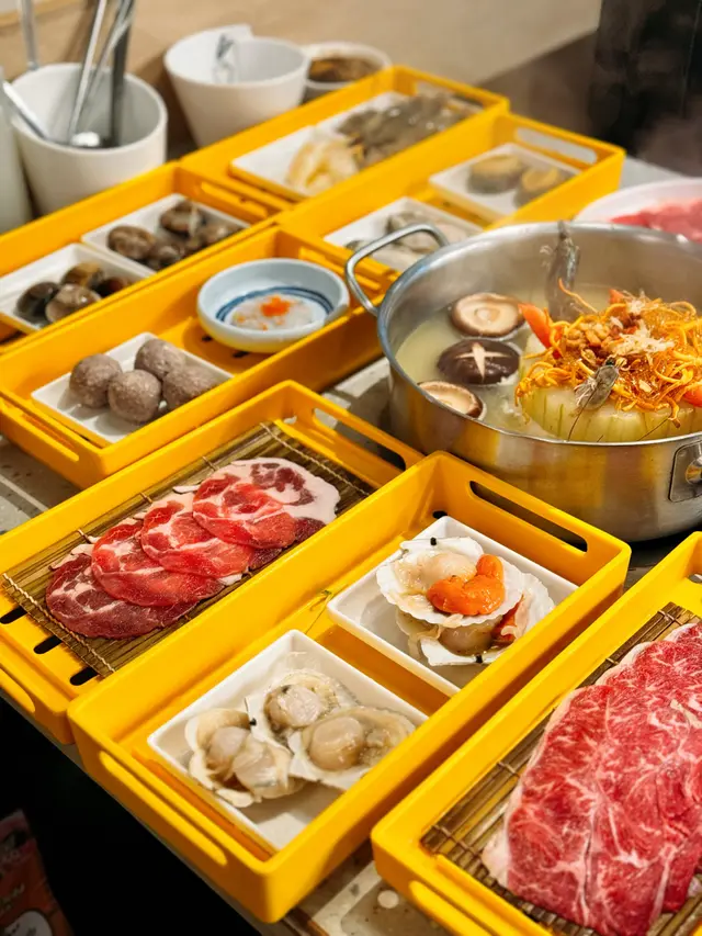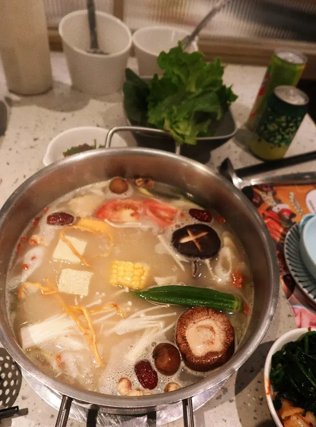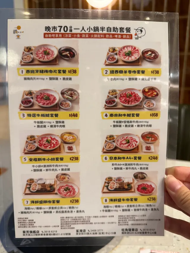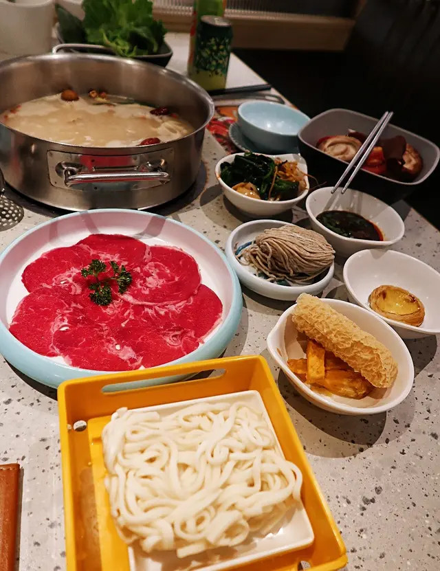 一鍋堂以「養生·靚湯·一鍋堂」為概念,午市更設有4小時火鍋放題,半自助火鍋放題及70分鐘定量火鍋放題,湯底多達12款,以一人一鍋形式,每天準備60斤以上豬骨及西施骨熬製新鮮湯底,絕不加色粉,湯頭鮮味十足,茶飲方面有自家製有營茶、季節茶酒,手作花茶養生,非常適合打邊爐!自助吧設有甜飲、火鍋配料、涼拌前菜、熱食。食足4個鐘,可以慢慢食嘢,又可以同朋友暢談!湯底款式豐富,包括自家麻辣鴨血豆腐湯、蝦米瑤柱冬瓜鍋、石橄欖五指毛桃雞湯、蘿蔔粟米豬骨蜆湯、沙爹牛肉湯、黃金椰子雞湯、怡寳椰香喇沙湯、咸菜胡椒豬肚雞湯、番茄著仔豬骨湯、酸辣排骨湯、藥膳滋養湯。我地揀咗沙爹牛肉湯、藥膳滋養湯。午市套餐A,牛板腱切得好薄,安格斯牛肉碌3-5秒就OK了,夾起勁似沙爹牛肉麵啲牛肉,好入味!好有驚喜嘅係壽喜燒黑豚肉,一啲都唔鞋,好滑!紐西蘭羊肉卷都唔錯,落單嘅時候可以見到每款肉大概碌幾耐,沙爹湯底非常濃郁,唔使額外蘸調料都好夠味了,整體黎講,肉嘅質素都唔錯呀!除咗放題常見嘅飲品外,佢地仲有自家製有營茶,有3款味道:檸檬茶鴨屎香、薄荷烏龍茶、洛神花茶。甜度有微糖、無糖,好啱打邊爐嘅時候飲,清熱解渴又可以調節消化。自家製季節茶酒,原來係花茶同酒調配出黎,茶味中細味酒精嘅微醺,味道都幾特別。…查看更多