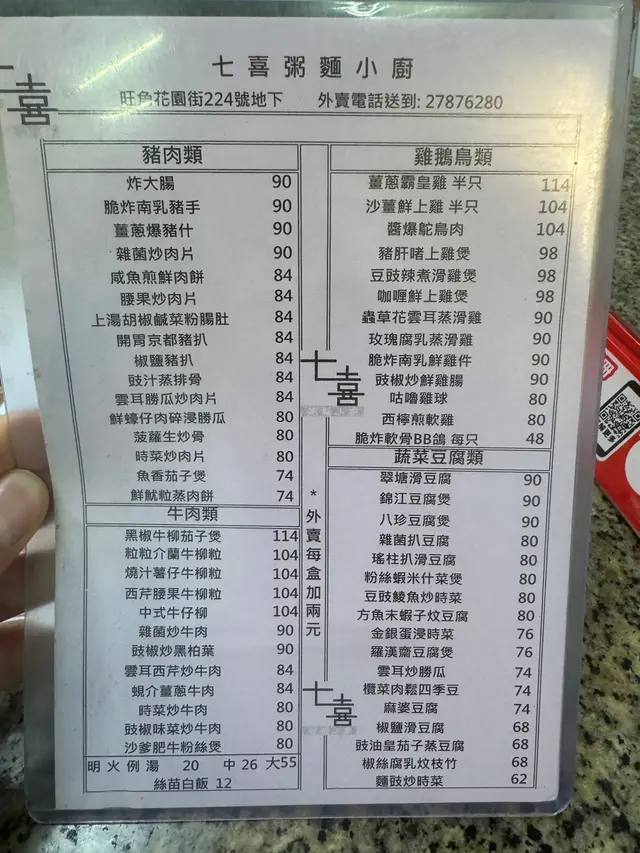 七喜粥麵小廚 (太子) 网址: https://s.openrice.com/QrLS05Gi000 地址: 香港太子花園街224號地舖 电话: +852 27876280