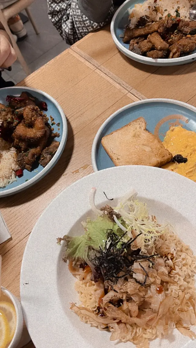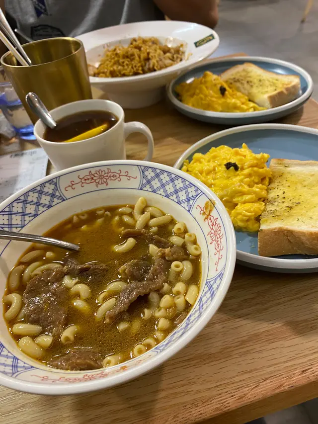 九龍灣食lunch有好多選擇  今次去附近一間茶記試試佢😜!    12:45去到,門口都排滿人😲 今日好彩算快有位,等咗大約10分鐘就入得  個啲人應該等外賣多 入面座位唔算迫,服務態度都幾好~   🍴常餐:日式燒豬頸肉撈公仔麵+黑松露炒滑蛋&蒜蓉牛油多士 $58 食物一嚟到 ,我同同事”嘩”咗聲,因為真係好大份🤣 豬頸肉有用燒汁一齊煮,好入味,撈麵係每一條都有醬汁包住,但又唔會過多,剛剛好😙  🍴常餐:沙嗲牛肉通粉+黑松露炒滑蛋&蒜蓉牛油多士 $52 沙嗲牛肉通粉就正常發揮,多牛肉片👍🏻 炒滑蛋都唔會馬虎,真係好滑,同蛋面會有適量嘅黑松露醬而個蒜蓉牛油多士,係每個位置都搽滿蒜蓉牛油,勁香勁好食😋  依個常餐真係好大份又高質,$58/$52真係性價比極高!! 細食嘅人真係會食唔晒,而大食嘅男仔會食到好滿足😎~查看更多