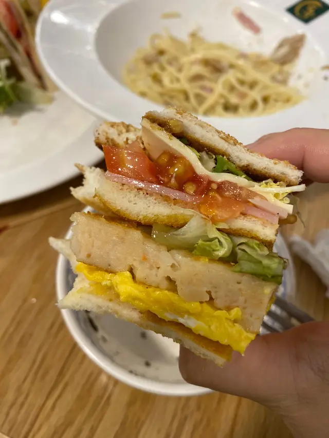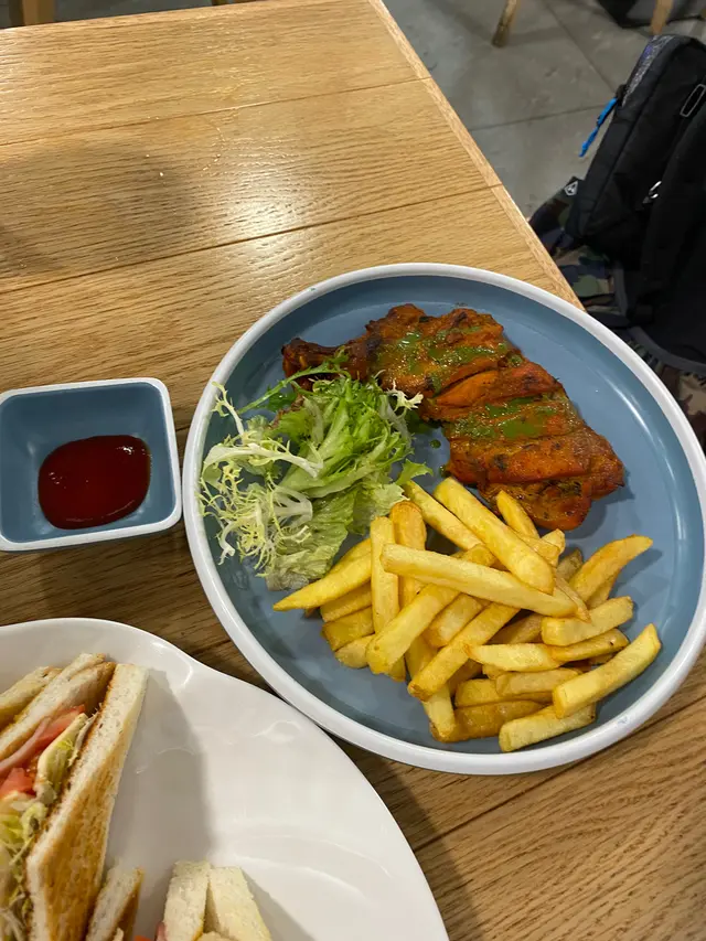 今日同朋友嚟開九龍灣,食厭咗地鐵站附近嘅餐廳,在openrice search到呢間嚟試下。下午茶點了蝦餅公司三文治$53 及天多利烤雞配薯條沙律$45。蝦餅公司三文治是第一次見,蝦餅食得出自家製,偏淋,味道幾好,蝦餅份量略細,但其他配料充足,三文治有烘底,總括新鮮熱辣辣幾好味!天多利烤雞原來是香料烤雞髀,似是印度的香料,上面再加綠色醬,是東南亞風味,以茶餐廳下午茶來說是幾有特色!而且仲要配薯條+沙律,份量充足。餐飲配凍檸茶,要讚一讚呢度服務很好,記得幫我哋走飲管呢!查看更多