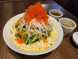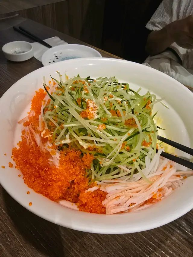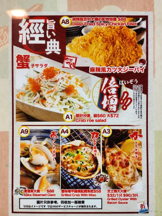趁打风前食餐日本菜,约朋友于佐敦食《七福神和食亭》。蟹子沙律(细)~ 唔好讲笑,"细''都咁大盘,超大量青瓜丝,仲有好多蟹子,个底有生菜丝添,捞埋蛋黄酱特别美味。豪快刺身盛合(五款)~ 大拖罗、深海池鱼、左口鱼、厚切三文鱼及带子,每款刺身都好新鲜,特别鲜甜。芝士焗天火蚝~ 忌廉汁加烟肉,铺满芝士焗嘅蚝,非常惹味。网烧牛扒~ 香浓牛味。鹿儿岛鳗鱼饭团~ 加咗鳗鱼汁烧嘅饭团,食到饭焦香,仲有肥美嘅鳗鱼。炸鸡软骨唐扬~ 即叫即榨鸡软骨,香脆可口,越食越想食。 寿喜烧牛肉锅烧乌冬~ 寿喜烧汤底唔算太甜,选用肥牛,配料仲有冬菇、豆腐、菜同本菇。 欣赏店员友善嘅招待,值得一赞。 …查看更多