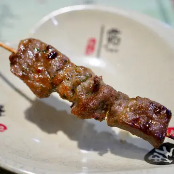 !烧卖一串3粒,经烧烤处理,加上调味粉加持,外层带脆,味道很香。不过美中不足就是烧卖偏粉团感。
