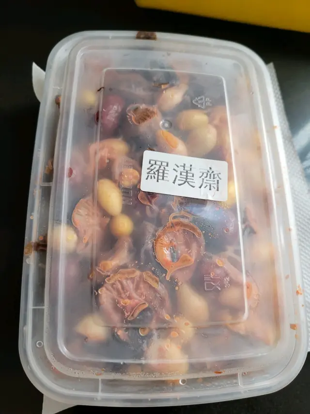 原本滿心欢喜去買了一盒罗汉齊比母亲吃的。好彩系我先试味道后才分配,若不是的话我妈妈便有机会吃到红棗时肯定牙齿都崩!粗制了。1.全部白果是苦的,必须強调,是全白果是苦的。2. 红棗有些还有去不了的骨,为什么我话糸骨呢?因为咬下是硬的,紅棗裏面的核沒有切清!最后,当然抽起所有的沒有给妈妈吃。唯有给妈妈吃东姑,付腐及木耳和粉丝了。 第二日去店反映以上的情况,老板娘讲白果就系冇拿条芯,所以苦。至于红棗沒有去除淨核便沒有反应。自己受敎訓了。呵呵!大家要注意,这店比较粗制!…查看更多