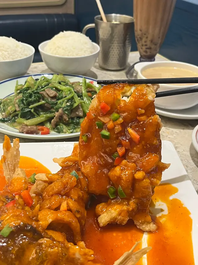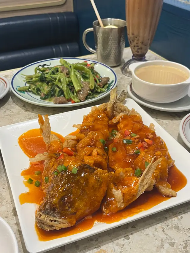 啟德airside一間性價比高嘅冰室,環境闊落坐得舒服,選擇豐富有小菜、粉麵、輕食,仲有得鋸扒!😍 叫咗幾款經典嘅菜式,非常好味~糖醋松子魚🐟冰室竟然食到呢款菜,賣相一流😍 糖醋汁酸酸甜甜,好開胃🤤松子魚好大份,炸得夠酥脆,魚肉都好滑,配飯食一流啊~跟餐嘅青紅蘿蔔老火湯一樣咁正,飲落好潤🥣椒絲腐乳通菜炒牛肉🥬另外叫多碟菜,通菜炒得夠鑊氣,仲好翠綠,加埋惹味嘅椒絲腐乳,送飯一流~牛肉都炒得好嫩滑,份量十足頭抽乾炒牛河🐄牛河炒得夠乾身,唔會太油膩,河粉同牛肉都好入味好滑,夠晒鑊氣🔥蜂蜜紅豆西多士🍞🍯最後我哋勁多個西多士,炸得金黃香脆,淋上蜂蜜,再加埋紅豆,夠晒邪惡🤤 紅豆夠晒綿,同西多士好夾!Read More