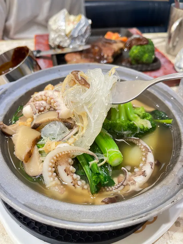 這家餐廳算在Airside價錢比較優惠的餐廳。⭐️海味粉絲雜菜煲套餐這道充滿港式風情的煲仔菜以彈牙粉絲為基底,有魷魚和蝦米的。西蘭花、菜心與小白菜形成清新的口感層次,適合追求清淡卻不失鮮味的食客。⭐️香辣牛肋肉條配米通創意十足的fusion菜式展現了廚師的巧思。牛肋條以慢煮方式處理得軟嫩入味,表面微焦帶出脂香,特調辣醬的辛香層次分明,最驚豔的是炸米通,酥脆的質地不僅平衡了肉條的油脂感,更模仿了韓式石鍋飯的鍋巴趣味。⭐️西冷牛扒套餐五成熟的安格斯西冷切面呈現誘人的粉紅色澤,焗薯頂部的乳酪煙肉碎鹹香濃郁,與綿密薯肉形成絕配;整套下來份量十足又不顯油膩。Read More