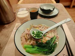 这家名叫「上海婆婆」的小馆子,整体氛围算温馨,感觉像在外婆家吃饭,不过食物却颇具话题性。这次点了一份下午茶餐,选择颇为奇特:北京炸酱面配一杯鲜豆浆,还有三块绿色芋泥饼。面条带点筋道,酱料咸香,偏甜口;不过和豆浆放在一起,多少有点「南北混搭」的意味,喝起来意外顺口。芋泥饼外层酥脆,里头带著绵密的芋头香,呈现的翠绿色比较出奇,却也没有违和感。 忍不住加了十五元试试鸡丝拌粉皮,爽滑的粉皮包裹著芝麻酱与鸡丝,口感清爽,不会太油腻,反而成为一餐里最讨喜的小配角。 重头戏当然是婆婆大笼包。与一般小笼汤包不同,店家俏皮地给了一支饮管,让你直接吸里面的汤汁。热腾腾的一口吸下,汤香浓郁,带著一点鲜甜,虽然形式感重了一点,但确实带来独特乐趣。最后的甜品是高力糯米雪糕,外层热乎乎又软糯,内里是冰冻雪糕,冰火交融,吃起来颇有惊喜。 整体而言,「上海婆婆」的餐点,不是走传统正经路线,而是加了不少创意巧思。味道虽未到惊为天人,但有趣、有心思,适合朋友们一起来轻松尝新。 …查看更多