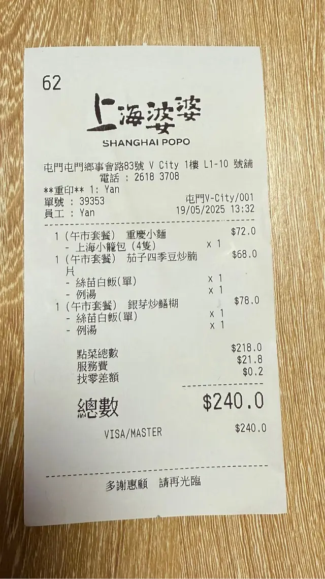 上海婆婆 (V City) (屯门) 网址: https://s.openrice.com/QrLS0guKD00 地址: 香港屯門屯門鄉事會路83號V City 1樓L1-10號舖 电话: +852 26183708