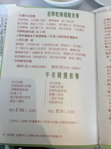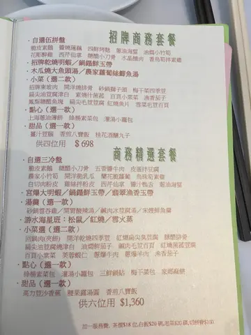 今日同同事庆生,订左位又来帮衬绿杨邨。虽然绿杨邨系中上格调的酒家,价钱比一般酒楼略贵,但物有所值,所以我们都很喜欢来这里。位于world trade 11楼,大玻璃窗令到人一入到黎会觉得好光猛,又有海景睇,配合典雅的装修,没有一般酒楼的嘈杂声,所以感觉就是与别不同。有次坐过里面一个私隐度极高又唔系包房的位置,也是不错的。今次一行5人,就叫了一个四人餐,这里的午市套餐系几抵食,所以我们通常也会叫这些餐。今次选了「招牌商务套餐」($698)。首先有自选五并盘,我们选了花雕醉鸡、水晶肴肉、四鲜烤麸、葱油海蜇同脆皮素鹅。每样小小,全部都好好味!