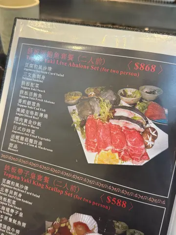 餐厅主打日式铁板烧,提供特惠午餐,包括沙律、前菜、扒类、甜品等,十分丰富。餐厅亦供应高级食材,如日本近江A5和牛、法国鹅肝等。