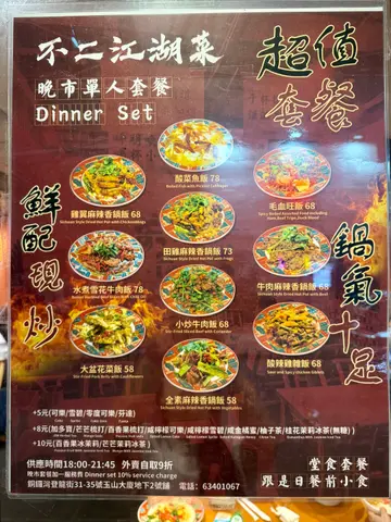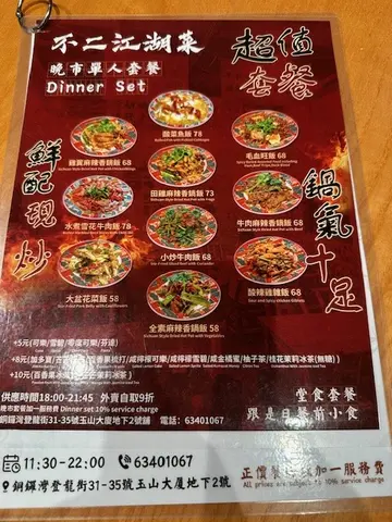 餐厅:不二江湖菜地点:铜锣湾登龙街菜式:川菜餐牌:午餐有套餐,有19款饭,有辣有唔辣,可以加钱要饮品。落单用QR code。不二酸菜鱼饭 $73 不二酸菜鱼好大兜,有连皮滑溜鱼片配有大量酸菜加莴苣片,材料丰富新鲜。可以拣辣度或者唔辣,我地叫左唔辣,都好够味,咸度刚好。鲜椒雪花牛肉饭 $73 呢个𩠌有唔少牛肉同埋红绿椒粒加莲藕粒同炒,我叫左少辣,味道已经够辣,唔食辣椒粒就唔辣,呢道菜有爽口莲藕粒好特别。农家小炒牛肉饭 $62 热辣辣上枱,好有镬气。好多嫩口牛肉片捞有菜苗,洋葱丝同紫洋葱丝同炒,味道咸香,好多料,呢个𩠌系唔辣,味道都好惹味。份量好多。每份𩠌都跟有一碗白饭。芒芒梳打 加$8百香果梳打 加$8冻柚子茶 加$8梳打超大杯,附上独立包装饮管。芒芒梳打芒果味浓,唔会太甜。百香果就清新d,仲加有青柠一件。冻柚子茶有唔少柚子皮喺底,甜度适中,三杯都好解渴解辣。总括而言,呢度食物质素高而好大份,呢个价钱抵食。餐厅星期日晚饭时间前都有唔少食客同外卖单。…查看更多