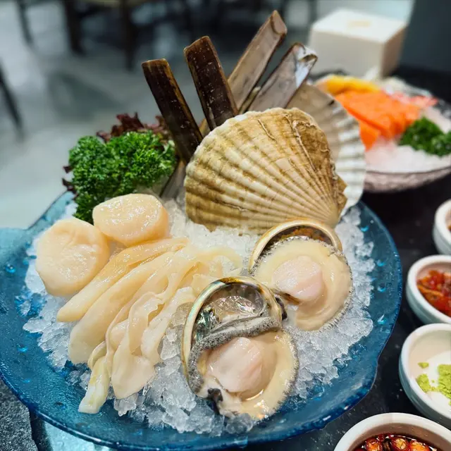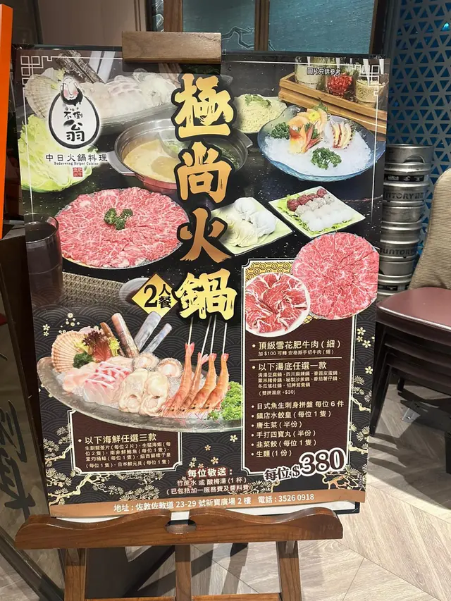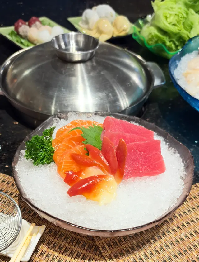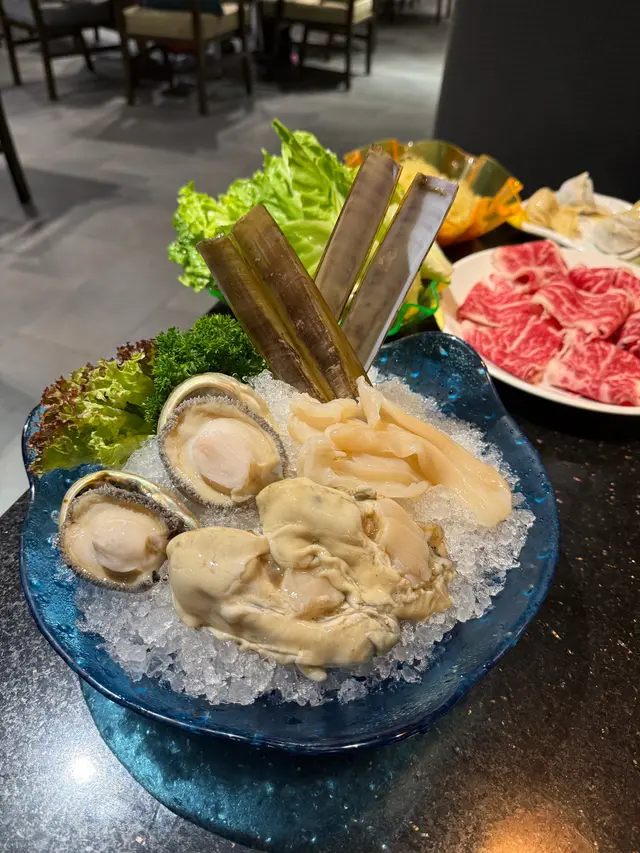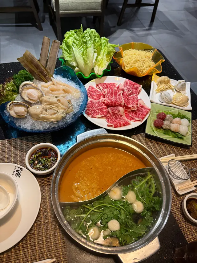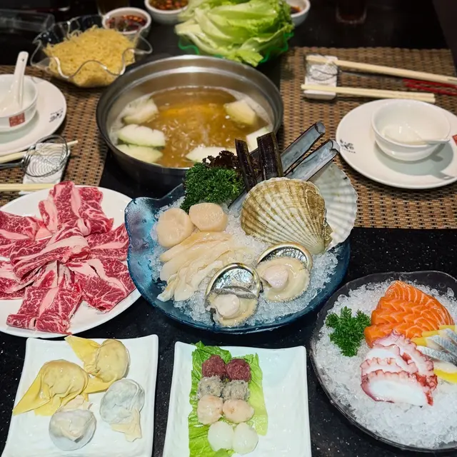 好耐冇食過打邊爐,搵到呢間食海鮮邊爐,嘢食好似幾高質,我哋order咗個二人餐,每位$380 ,包咗刺身拼盤,三款新鮮海鮮,火鍋配料湯底,每人一杯嘢飲,仲要茶介+1全包,價錢非常合理。先嚟個刺身拼盤,刺身有吞拿魚、三文魚、同埋八爪魚,三文魚好厚切肥美,吞拿魚同埋八爪魚都新鮮,質素好OK。跟住呢就開始食火鍋,我揀咗招牌鴛鴦鍋底,有芫荽皮蛋湯同埋沙嗲湯底。海鮮呢就一開始食芫荽皮蛋湯,食海鮮嘅鮮味。蟶子王好大隻,肉身好厚,超級爽嫩鮮甜,裙邊嘅部份好爽脆,拖一拖就食得。桶蠔好大隻,咬落去卜一聲鮑汁,鮮味creamy。南非鮑魚都好大隻口肉,最重要係一啲都唔韌,爽嫰爽嫩,好正。食完海鮮我哋就食頂級雪花肥牛,牛肉好靚,雪花均勻適中,唔會太肥冇得食,肉質軟嫩,牛味濃郁,沾上我自己調製嘅火鍋醬油好好味。手打丸有牛丸、鯪魚丸、蝦丸同埋墨魚丸,細細粒迷你版,一口一粒,每款都真材實料,爽彈爽彈。水餃同埋雲吞好有驚喜,特別係嗰隻鮮蝦雲吞,皮薄餡靚,個皮滑溜溜,裏面包住好多隻蝦,超級爽口,而且蝦味濃郁,似係海蝦。最後食埋啲菜同埋個超級爽口嘅生麵已經好飽好滿足。點知原來仲有個甜品送,係桂花杞子糕同埋椰汁馬豆糕,兩款都好清甜,食到飽晒食都唔會覺得腻。…查看更多