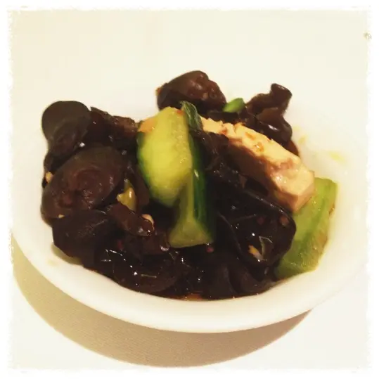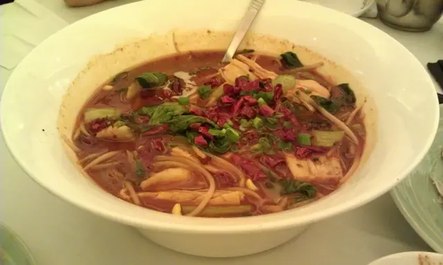 另一道菜是 "金沙海鮮燴豆腐". 金沙即是咸蛋黃, 配襯入清淡的豆腐和鮮味的海鮮, 味道恰到好處. 海鮮方面, 也很足料, 有蝦 (雖是雪蝦略嫌鮮味不足, 但很爽脆), 魚塊, 鮑貝和帶子都非常多, 而且味鮮."牛肝菌粉條煮土雞", 是媽媽選的. 菜式以一個瓦的器皿盛載, 因此能 keep 到好耐都夠熱. 原來粉條是紅薯粉, 口感彈牙, 吸了汁料十分可口