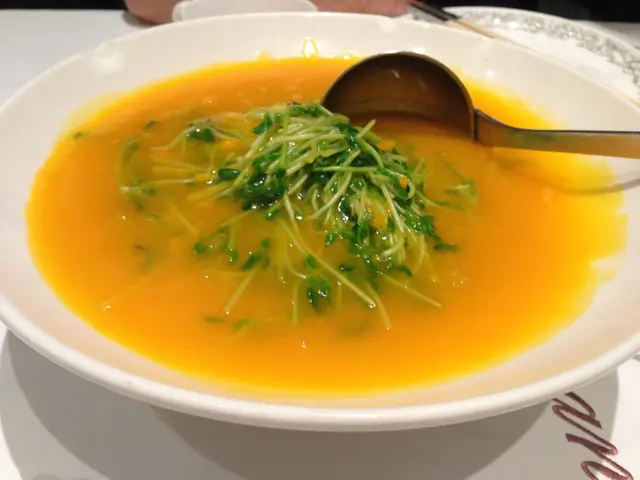 星期五的晚上, 約了媽媽出外食飯, 原本是打算去 euro go go 的, 因為媽喜歡食麵包布甸. 可惜人太多, 很多檯都有人在等候, 於是打算去另一間食肆晚飯. 但星期五晚上實在很多人出外用膳, 走著走著, 上到新都會5樓, 看見中國芳, 便決定試問一下有無位, 幸好二人檯不用等候.這是我第一次幫襯的食肆, 因為平時比較少吃中菜, 所以有很多中菜館都未去過. 入到去, 其實都很多人, 如果人多要大檯 walk in 應該一定唔得喇 ... 由於這裡是主要吃京菜的, 因此很多大檯都例必有隻片皮鴨. 但我們母女二人一向不是食肉獸, 而且得兩個人都無可能食到, 所以我們都點了一些不太滯口的食物.一看到餐牌, 我便看到這道 "金湯翡翠苗". 我知道 "金湯即是南瓜湯", 而翡翠苗即是溫室豆苗. 個人一向喜愛南瓜清甜的味道, 所有用南瓜做的菜式我都喜愛, 而溫室豆苗爽脆可口, 亦深得我心. 上檯後, 果然不負所望, 南瓜湯打得很幼滑, 翡翠苖浸在其中, 去了少許苗的粗糙感, 同樣變得幼滑了. 而且份量相當多, 成個湯碗咁多的份量, 好像吃極也吃不完