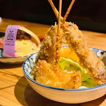 今日听人介绍同朋友去咗Jung39 Japan食晚饭,两个人嗌咗几款嘢嚟share,整体嚟讲都几有惊喜!😆🧀🧇焦糖鹅肝伴多士真心正,冻鹅肝外层微脆,入口好似食芝士咁,配好似酒煮过嘅提子干、甜甜哋嘅焦糖同脆多士,邪恶但好满足~🐟蜜渍炙烧油甘鱼配柚子醋好清新,鱼肉油润得来又唔腻,个汁酸酸甜甜好开胃!仲有另一款系烧汁嘅~🍢串烧试咗鸡柳、特选牛,仲有芦笋猪肉卷~牛肉同鸡肉都烧得啱啱好,肉质唔会韧;芦笋卷个配搭好夹,猪肉香口,芦笋爽脆,抵食!🍤仲有个吉列大虾,份量好足够!🍲最印象深刻系个初秋・和牛・栗子・野菌釜饭(小),一打开盖已经香到晕~原来系黑松露酱!!和牛嫩滑,栗子同野菌增加咗口感同层次,饭吸晒啲精华,仲要煮到有饭焦,脆卜卜,我同朋友都抢住食!我嗌多咗个辣味笋,用嚟捞饭十分惹味!🥰👍🏻饮品就嗌咗杯蜜桃梅酒同姜味汽水,甜甜哋易入口,女仔应该会钟意~其实店舖最出名系香港少有嘅牛肠,有牛肠锅同烧牛肠,奈何同行朋友唔食内脏,唯有下次再约同好品尝!😭另外不得不赞店员服务非常殷勤,而且有个特色系厨房主理嘅都系高大猛男,细细个厨房有几个身型魁梧嘅人忙里忙外,感觉好得意!👀❤️整体嚟讲都会想再encore嘅店,推荐大家试下佢嘅釜饭同鹅肝~下次真系想试下个牛肠锅!#串カツ専门店 #铜锣湾 #串扬 #炸串 #铜锣湾美食 #深夜食堂 #牛肠锅…查看更多