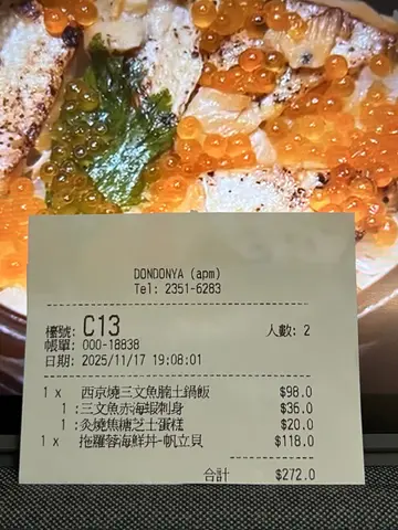 冷风到🥶最啱食热辣辣嘅日式土锅饭🔥🔸西京烧三文鱼腩土锅饭🧡 $98原个土锅饭整煲送到面前即叫即煲,热辣辣又香喷喷😍中火先煲15分钟再焗5分钟🔥 店员会帮手较闹钟,唔怕煲过火~一打开系西京烧三文鱼腩咸甜咸甜嘅香气🤤饭粒吸满鲣鱼高汤嘅汤汁,再加埋三文鱼腩嘅丰富油脂,食落鲜味浓郁😋三文鱼腩油香十足而且食落软嫩,加埋一咬即爆嘅三文鱼籽真系画龙点睛🤩🔸三文鱼赤海虾刺身🧡 $36三文鱼入口细腻柔软,赤海虾大只又鲜甜🤤🔸拖罗蓉帆立贝海鲜丼🤍 $118成座山咁高嘅海鲜丼🫣 入面有拖罗蓉、三文鱼粒、厚切帆立贝,加埋满满嘅三文鱼籽就成为呢座海鲜小山丘🤩🔸炙烧焦糖芝士蛋糕💛 $20芝士蛋糕表面有微苦焦脆嘅焦糖外层,芝士蛋糕好软滑,两者配合甜而不腻😋天气转凉想享受温暖嘅幸福时刻,日式土锅饭真系啱晒呢排食😋 二人埋单唔洗$300💛🐾猫奴足迹🐾🌐丼丼屋 (观塘) @dondonyahk📍观塘观塘道418号创纪之城五期(apm)6楼L6-3b号舖…查看更多