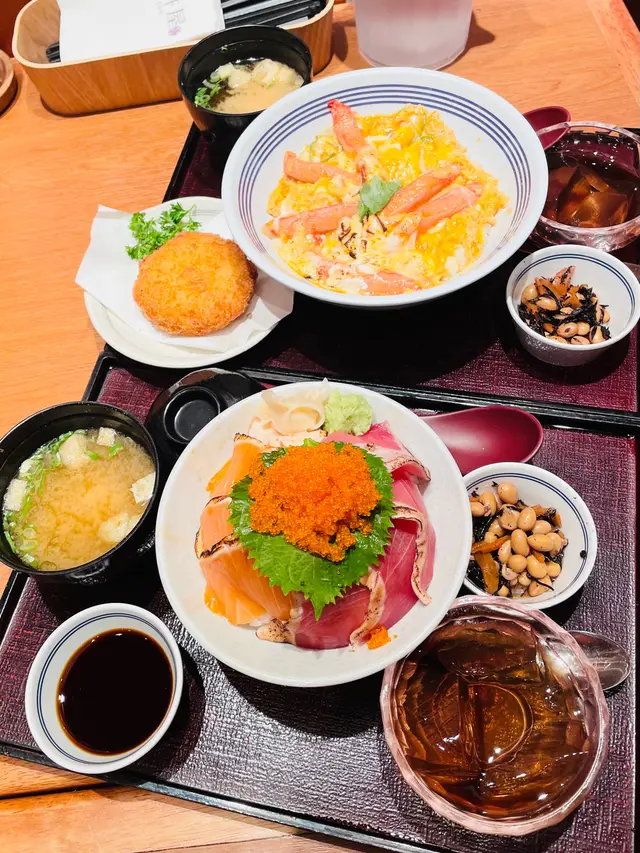 最近經過 丼丼屋 見到推出咗定食優惠,所以試咗全新嘅「雙色刺身丼定食」同啱哂小朋友嘅「芝士蟹柳滑蛋丼定食」餐廳環境光猛,座位闊落,店員親切友善!芝士蟹柳滑蛋丼定食(包括前菜、味噌湯、甜品及果茶)嫩滑嘅雞蛋🍳同濃郁嘅芝士🧀配搭真係好夾,蟹柳嘅鮮味令口感層次豐富,小朋友好鍾意!雙色刺身丼定食(包括前菜、味噌湯、甜品及果茶)肥美嘅三文魚同鮮甜濃郁嘅吞拿魚,加上滿滿嘅蟹籽,啖啖都有豐富嘅海鮮味!唔錯👍🏻查看更多