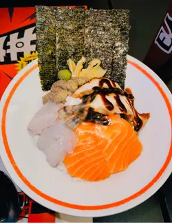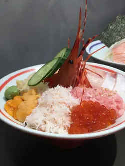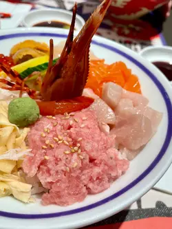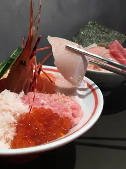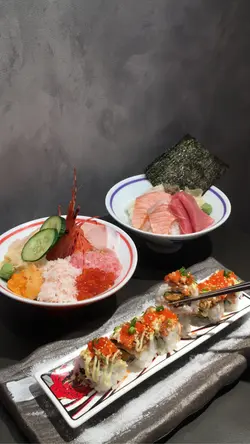 。自選丼飯,今次試試八餸丼飯,滿滿一碗真系海鮮盛宴。丼飯揀咗火炙,珍寶赤蝦超大只,肉質爽甜彈牙。鰻魚片燒得香軟入味,北極貝鮮甜爽口。火炙三文魚同左口魚邊油脂爆燈,入口即化。日本帶子厚身又Creamy,每種刺身都好新鮮鮮甜。下麵飯底調味唔錯,飯底醋味溫和,刺身鋪到滿一滿,撈埋wasabi同醬油,每一啖都系大海嘅味道