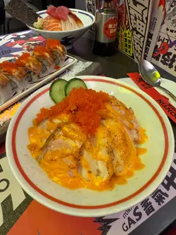 。焦糖三文魚卷,呢個焦糖三文魚卷真係好得意,會噴火嘅。侍應送上來以後,即刻用火槍點火,好啱打卡。面頭微微燒過嘅三文魚帶啲焦香,咬落去外層微甜香脆,裡面卷住嘅蟹籽卜卜脆,加埋青瓜,玉子同蟹棒,口感好豐富:)。雙餸“三揀二” 丼,揀咗牛舌同鯖魚。鯖魚燒得皮脆肉嫩,魚油香濃但唔會腥,上面灑咗少許芝麻同蔥花,吊味一流。牛舌厚度切得啱啱好,燒得淋滑又彈牙。飯底用咗日本珍珠米,吸滿鯖魚同牛舌嘅肉汁,每一啖都好滿足