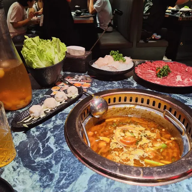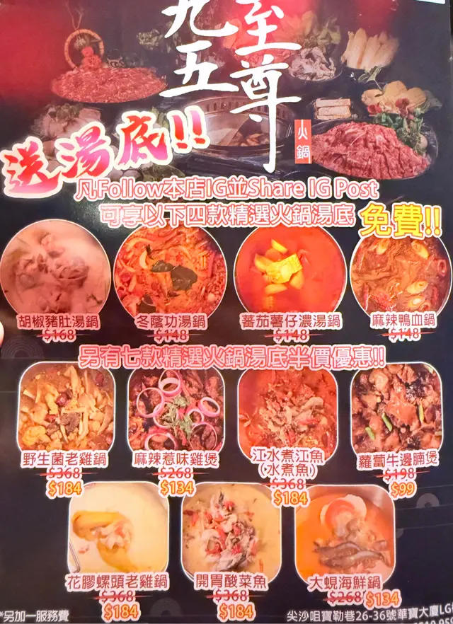 最近天氣開始涼,成日都諗住邊度可以同朋友開鍋取暖~上次試咗尖沙咀呢間 九五至尊火鍋狗毛,真係吾錯!😋 🐔 花膠螺頭老雞鍋 - 一上枱已經聞到香氣~湯底好濃郁,飲落順喉又有膠質感,啖湯真係飲唔停😌,打邊爐前先飲返兩碗都唔過份~ 🍖 蒙古羊肉片 - 呢個係我嘅心水!薄切羊肉片,好快熟,滾幾秒就啱啱好。冇我想像中咁羶,反而好嫩好滑🤤。 🦐 海鮮拼盤 & 手打蝦滑 - 海鮮都夠新鮮,帶子、青口、蝦都幾實淨。蝦滑真係要讚😋~ 🦐海鮮拼盤- 海鮮迷一定唔可以錯過呢份~蝦、帶子、鮑魚、花甲全部都新鮮得嚟有光澤,一上枱就知道啱啱起貨。🍯 凍龍眼蜜 - 食完火鍋要清清味先夠完美~凍龍眼蜜甜度啱啱好,飲完成個人涼返晒✨。 💥 優惠都唔少 💥 🕘10點前嚟杯SAPPORO 啤酒🍺放鬆下~ 👉 任食麻辣鴨血 or 蜂巢豆腐 **$88 買1送1!**🌙 10點後入座全單 火鍋食材 8折(飲品唔包)~夜鬼們有福啦😎 📱Follow & Share IG 再送湯底!打卡完仲可以拎免費湯底: - 胡椒豬肚湯鍋 - 冬蔭功湯鍋 - 蕃茄薯仔濃湯鍋 - 麻辣鴨血鍋 想試其他味?仲有多款湯底半價~抵食又有得玩🔥 環境幾舒服,座位闊,成間店氣氛好 chill;職員又好有禮,幫手快手唔拖拉👏。地點喺尖沙咀中心,一出地鐵就到,約朋友、開宵夜局都方便💬。…查看更多