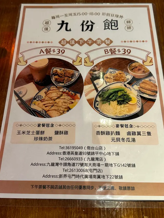 不錯的台灣美食選擇 shopkid等级22024-03-211K 浏览 关注 有嚟過呢度食正餐同埋下午茶,但個人特別喜歡這裏的下午茶,只有A餐同B餐,小弟兩個都有試過,喜歡A餐嘅原因當然係食佢個蛋餅,珍珠奶茶可凍可熱可少甜,鹽酥雞好食,之前天氣比較凍我會比較想食B餐,元貝冬瓜湯同埋香酥雞扒麵呢個組合真係最佳組合,食物水準真係唔錯,特別係個湯麵同埋個湯,真心夠熱👍,香酥雞扒好食👍,不過嚟過咁多次服務水平真係有待改善,試過幾次聽到服務員好大聲傾偈吹水,令到用餐體驗非常差,下午茶$39真心高質冇投訴,會唔會會推薦?如果係純粹講食物當然推薦😆…查看更多+ 4以上食记乃用户个人意见 , 并不代表OpenRice之观点。赞好分享不錯的台灣美食選擇 九份飽 (屯門時代廣場南翼) https://s.openrice.com/QrLT0LTnH00检举 张贴 评分4味道4环境2服务4卫生4抵食推介美食玉米起司蛋餅用餐日期2024-03-21用餐途径堂食人均消费$39 (下午茶)