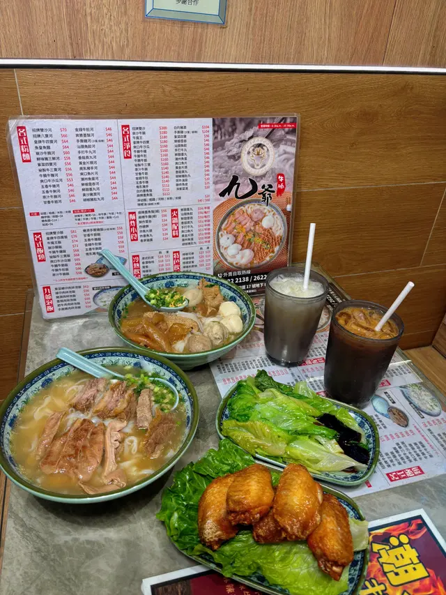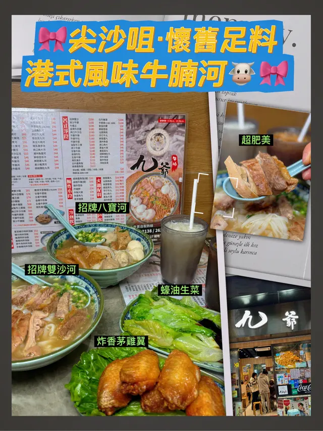 🎀尖沙咀。懷舊足料港式風味牛腩河🐮🎀🪄店名* #九爺牛腩🔮地址* 香港尖沙咀漢口道17號新聲大廈地下F及G號舖 🔮🗾分店地區🗾 沒有分店💰價錢$198 (2人)➖➖➖➖➖➖➖➖➖➖➖➖➖想睇更多同區推介👉地區搜尋🔍🗾#pickyme_尖沙咀剩系食呢一類👉食物類型搜尋🔍🍜#pickyme_港式➖➖➖➖➖➖➖➖➖➖➖➖➖🎵餐廳環境🎵位於尖沙咀漢口道,是典型的港式粉麵店,裝修簡潔,環境乾淨企理。店內設有卡位及圓桌,即使下午茶時段也常座無虛席,吸引不少本地人與遊客排隊光顧。餐廳位置便利,從港鐵尖沙咀/尖東站L5出口步行約1分鐘即可到達。🍽️食物質素🍽️餐廳主打牛腩,提供多個牛部位選擇,如崩沙牛腩、牛筋、牛肚等。其中崩沙牛腩筋膜相間、肉質軟腍,很多客人推介。此外,亦有豬手、鮮味豬三鮮等非牛選擇。招牌八寶河材料豐富,份量十足。特色小食如香茅雞翼和酥炸魚皮也頗受好評。整體價格親民,套餐約五十多元起,性價比高。👀評分💖💖💖💖💖🪄招牌八寶河$66 +$8凍鴛鴦招牌八寶河適合想一次嘗試多種配料的顧客。碗中有四款丸類和四款牛部位,包括牛肚、牛筋、牛腩和金钱肚。牛腩燉得軟嫩,牛筋有嚼勁,丸類口感紮實。湯頭清淡順口,河粉滑嫩易入口,整體搭配不錯。👀評分💖💖💖💖💖🪄招牌雙沙河$70 +$8凍杏霜雙沙河包含崩沙腩和牛沙瓜兩種部位。崩沙腩肥瘦適中,帶著筋膜口感;牛沙瓜較為爽脆。兩種部位搭配起來層次豐富,湯頭清甜。凍杏霜味道香醇,剛好可以平衡牛肉的濃郁感。👀評分💖💖💖💖💖🪄蠔油生菜+$12🪄炸香茅雞翼$34蠔油生菜份量足夠,菜葉新鮮爽脆,蠔油不會過鹹,是簡單的配菜選擇。香茅雞翼一份五隻,價格合理。外皮炸得酥脆,肉質保持嫩度,香茅味淡淡的,吃起來不會太油膩。(5個💖為最高)✴️✴️✴️✴️✴️✴️✴️✴️✴️✴️✴️✴️✴️⚜️整體評級⚜️🎈味道評分*😋😋😋😋😋🎈環境質素*🎇🎇🎇🎇🎇🎈抵食程度*💰💰💰💰💰🎈服務態度*💌💌💌💌💌查看更多