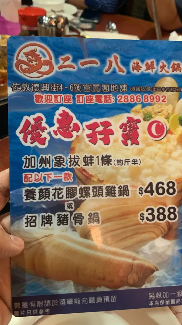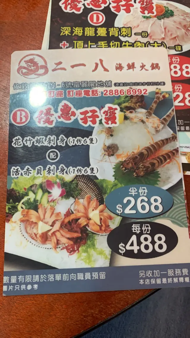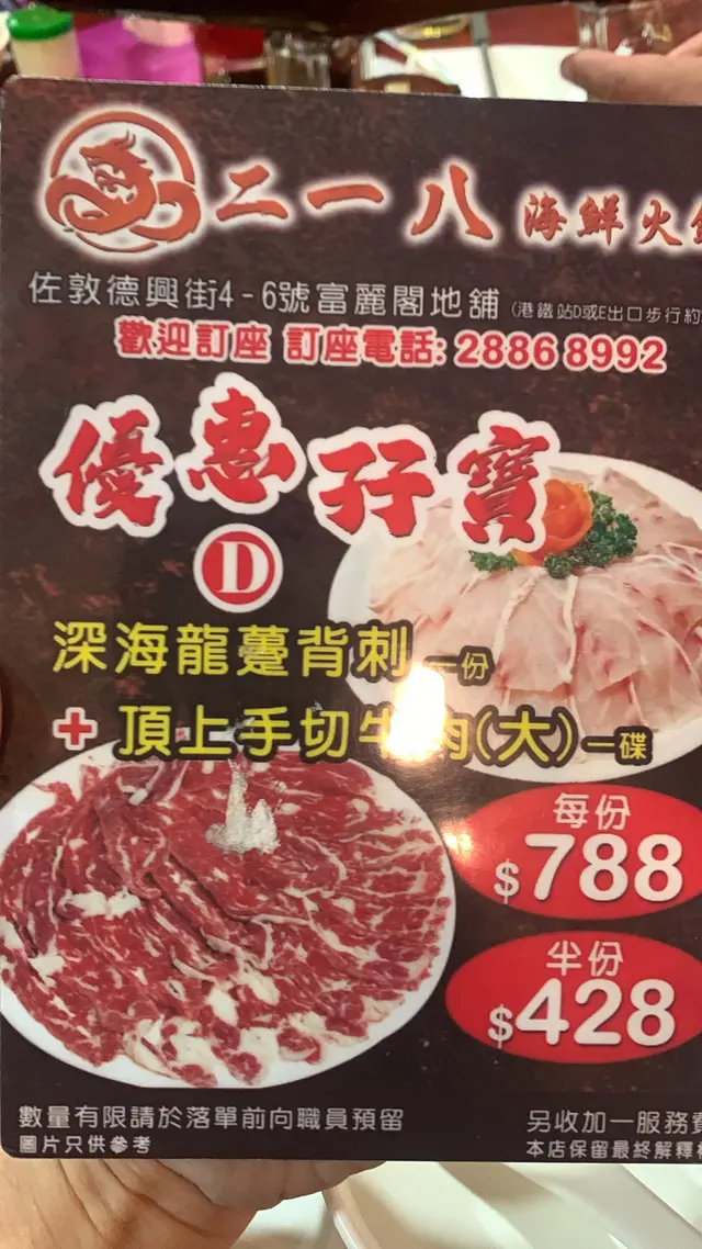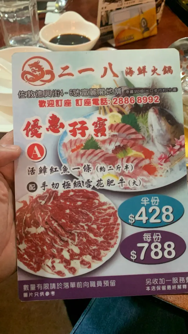 其實我算比較少出街打邊爐,就算去都係去開一兩間。今次朋友揀左係佐敦呢間二一八海鮮火鍋。我地5個人安排左卡位俾我地坐,入面仲有電視睇添😁叫左兩個孖寶,好抵食。一份活鱆紅魚併手切肥牛 $788。原來個鱆紅魚係刺身,我頭幾塊仲傻傻下淥左黎食😆刺身勁新鮮,肉質彈牙又鮮甜,好推薦食刺身嘅你一定要點!食哂之後,佢地會黎收返條骨然後炸到脆卜卜當一個小食!肥牛切到剛剛好,淥幾秒口感岩岩好👍🏻另外會一個孖寶係象拔蚌併俾湯底$388,象拔蚌反而覺得唔夠喇鮮甜,不過都係新鮮的。另外推介黃金魚皮$68,落咗椒鹽去炸,好香口!雞腸,非常爽口,入口鮮甜,唔怕食內臟嘅你可以一試!丸類都係正常水準,唔會伏。不過韭菜餃就一般般,皮太厚,可以唔使叫。埋單5個人,飲埋啤酒大約$2400,比起出面按人頭計任食嘅火鍋,我絕對推薦呢度!記得訂位,都幾full下!📍:佐敦德興街4-6號富麗閣地舖查看更多