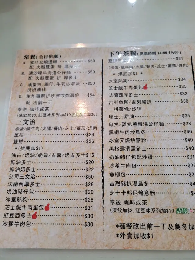 下午茶時間入去想食個下午茶餐,當時人唔多,有幾枱客啦,櫻面侍應有3個,不過因為樓面都大,所以佢地個企位係前中後,前面近門口的兼埋收銀。咁我坐低想嗌野啦,點知企中間的哥哥仔只顧玩電話,完全唔理D客,舉極手都睇唔到我,最後我要大嗌佢先望一望我,然後佢見企前場的姐姐行緊過去我度所以佢就繼續玩電話,真係令人嘆為觀止,可能佢係老闆啦,不過如果係老闆唔係應該更加緊張D客咩?講返野食,佢個西多士係唔錯嘅,厚多士,入面都夠乾身真係難得,幾好食。不過服務就……查看更多